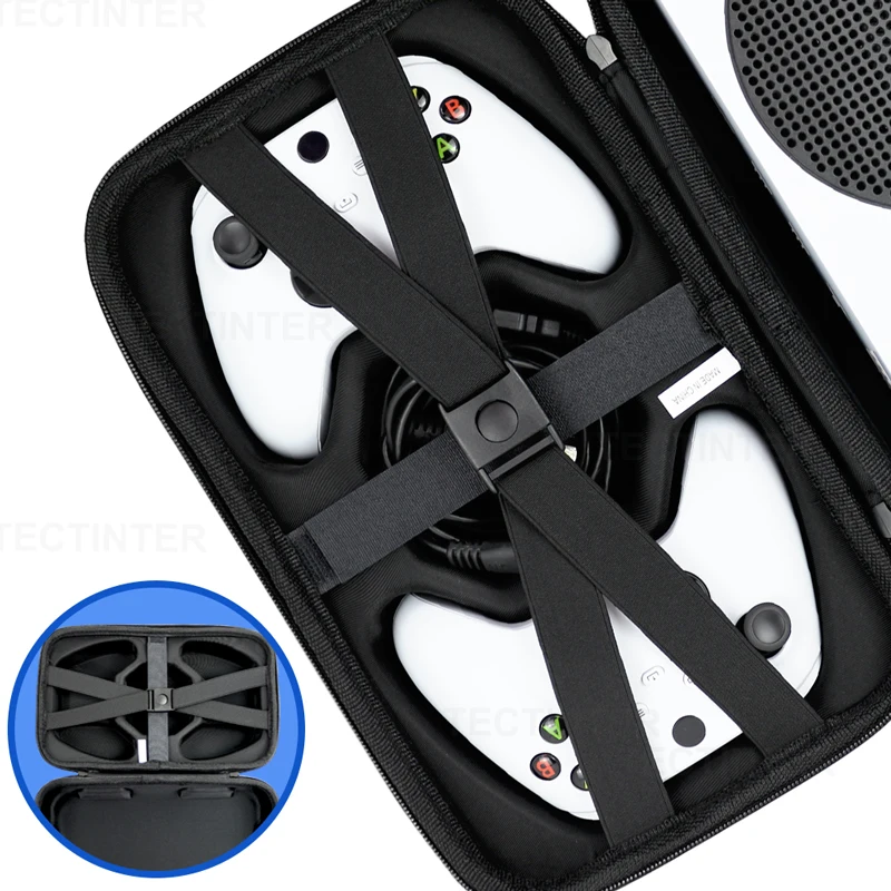 Se adapta a su consola de juegos y controladores Xbox Series S, con correas elásticas dedicadas para mantener el controlador en su lugar, con espacio adicional para otros accesorios como cables y cargadores.