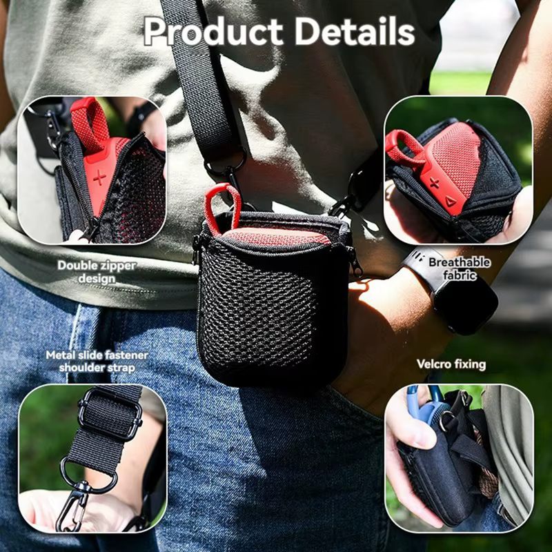2.El material es una combinación de malla + tela Oxford + EVA, que es resistente y duradero, y la calidad del sonido no se ve afectada al tocar el altavoz;