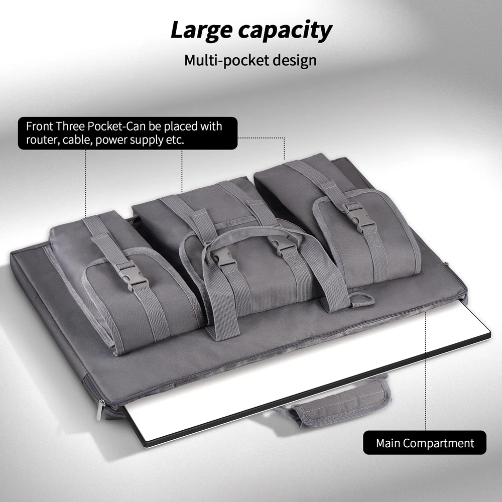 2.Práctico bolsillo frontal organizado para administración de accesorios: cuenta con un bolsillo frontal de fácil acceso que es ideal para organizar y almacenar ordenadamente cables, fuentes de alimentación y otros accesorios esenciales, manteniéndolos al alcance y sin enredos.
