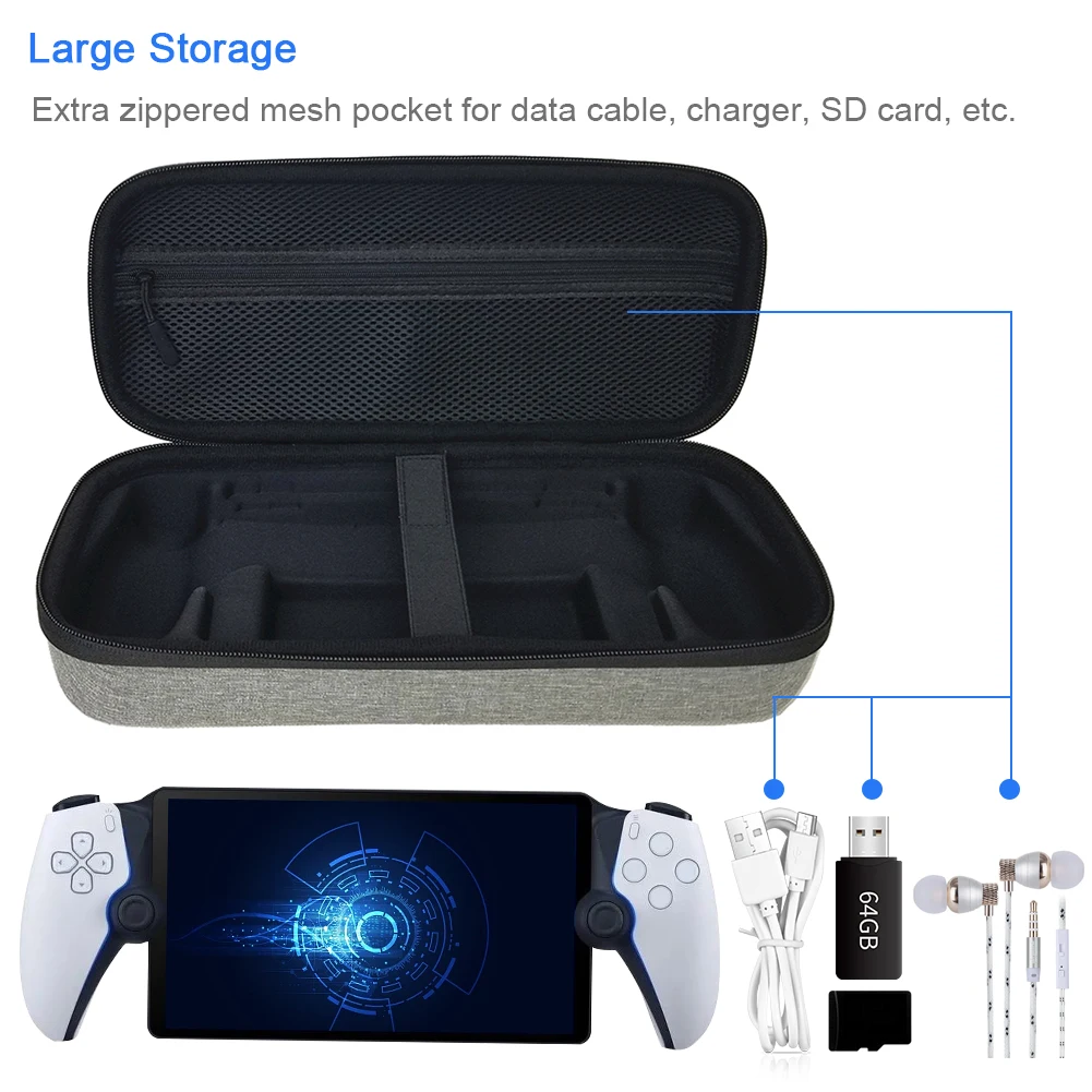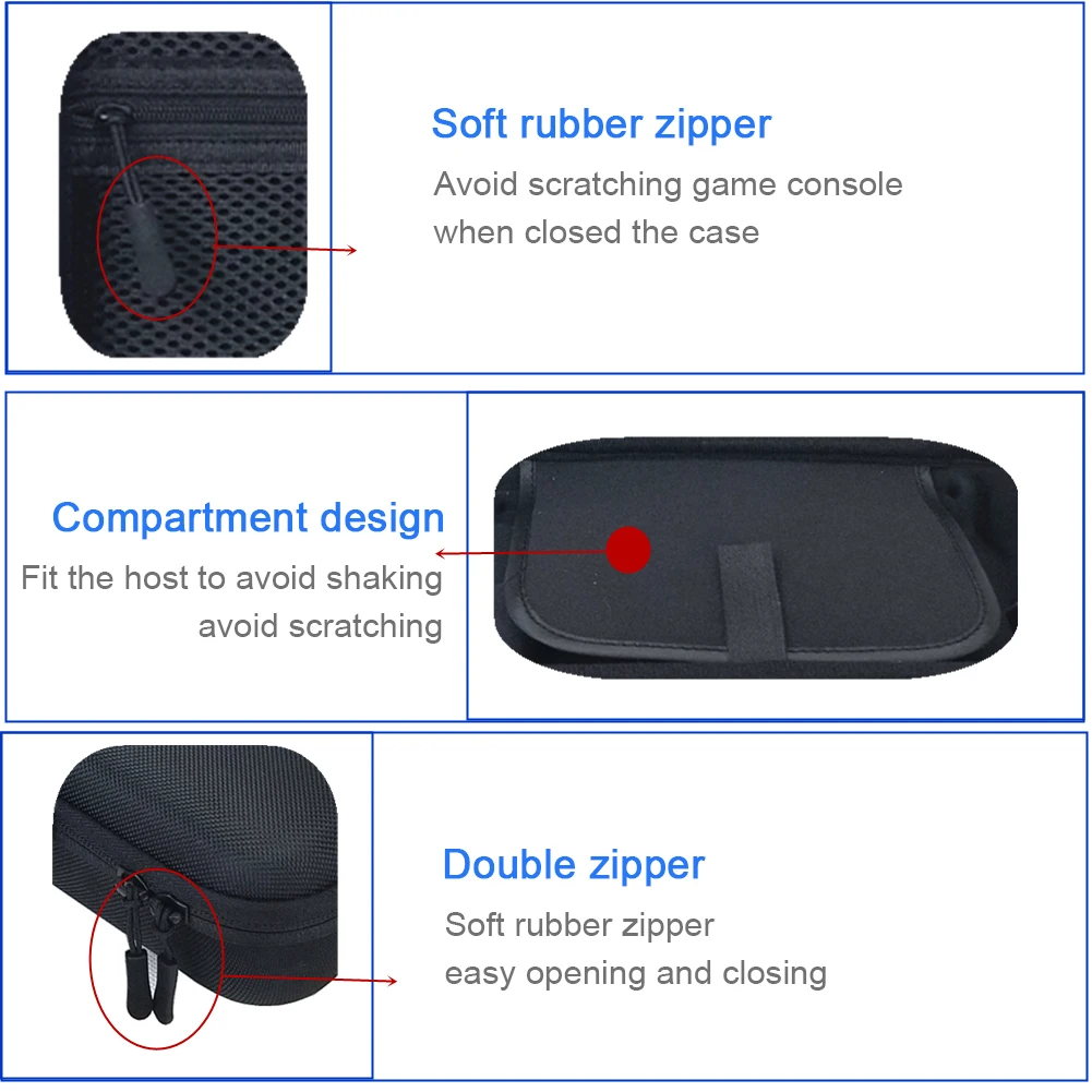 3. Protección interior:La bolsa de transporte cuenta con una banda elástica y un diseño de compartimento opcional para asegurar la consola, evitando que tiemble y se raye. La ranura personalizada dentro de la carcasa está diseñada específicamente para la consola de juegos. Un bolsillo de malla con cremallera adicional está disponible para almacenar cables, cargadores, tarjetas y otros accesorios SD, asegurando que todo esté organizado.