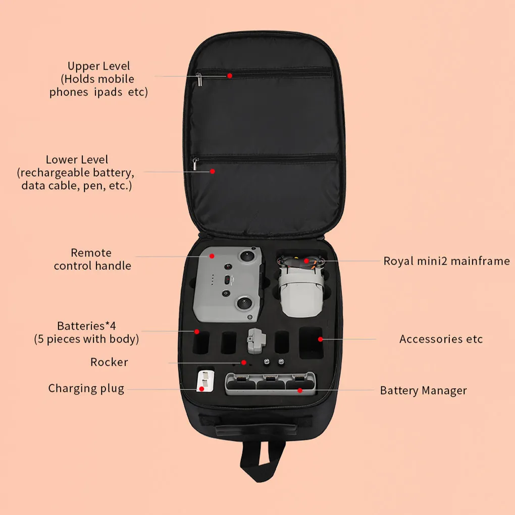 Conozca el almacenamiento diario: este estuche de almacenamiento aprovecha al máximo el espacio de almacenamiento, puede satisfacer al máximo el almacenamiento diario, la partición en el medio de la bolsa no solo puede proteger el Mini 2, sino también almacenar pequeños accesorios.