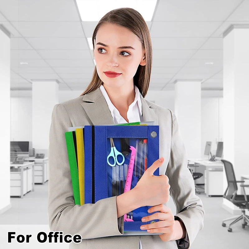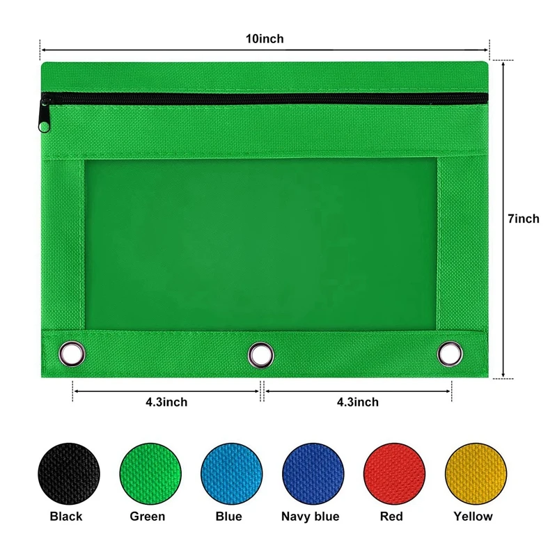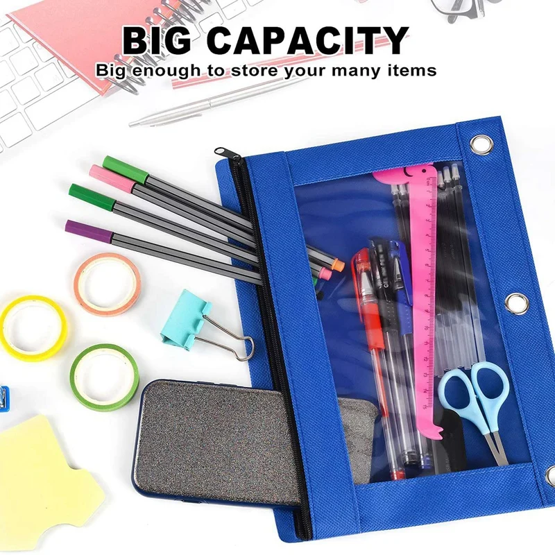 3 anillos que se ajustan a las carpetas: La bolsa de lápiz con cremallera se sujeta en carpetas de 3 anillos estándar, los agujeros reforzados con remaches encajan en carpetas de 3 anillos estándar, que se puede colocar en carpetas o colgar en la pared.