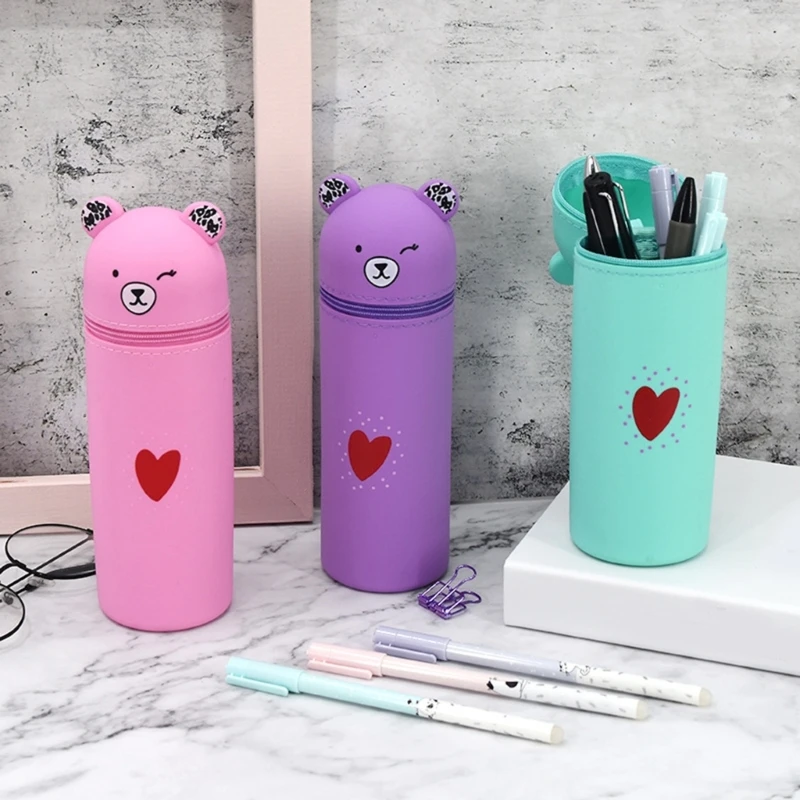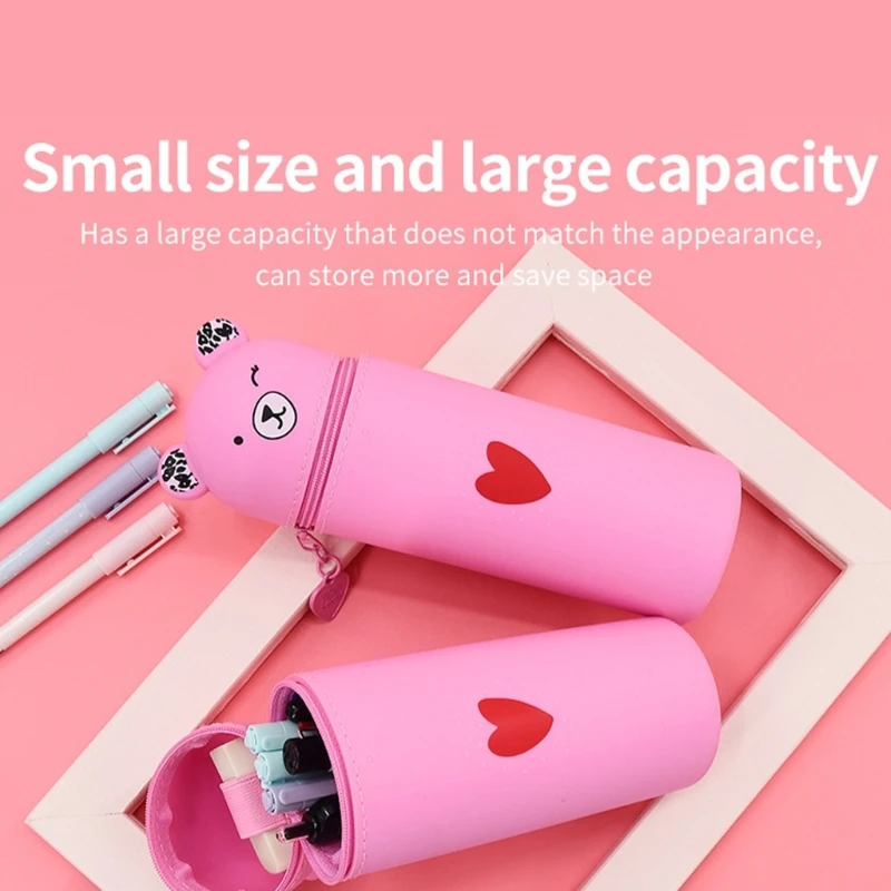 Estuche multifuncional para lápices, cada estuche para bolígrafos con forma de oso de dibujos animados con ranura elástica para guardar borradores.El compartimento principal grande puede almacenar entre 15 y 25 bolígrafos, lápices, reglas, marcadores y resaltadores.Podría usarse como portalápices de escritorio, estuche para bolígrafos o estuche para bolígrafos de viaje.
