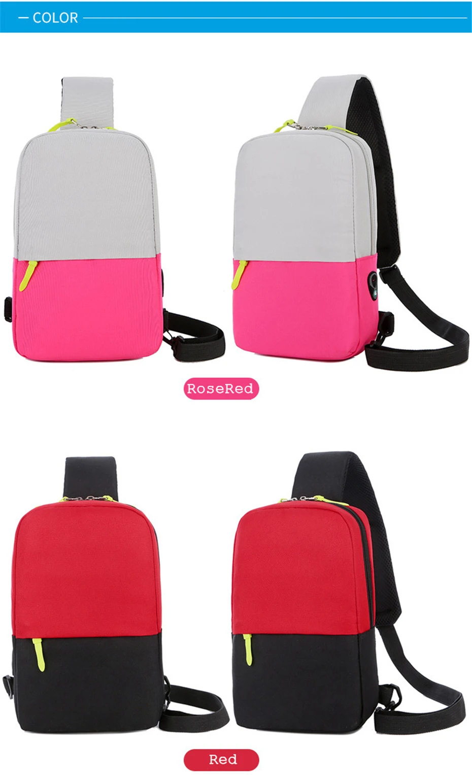 1. Color: negro, gris oscuro, azul, rojo rosado, rojo