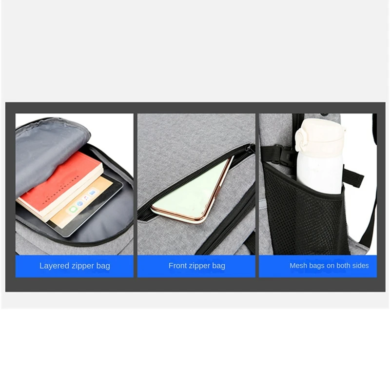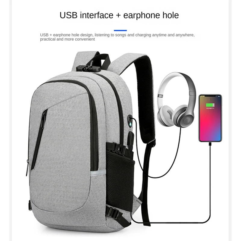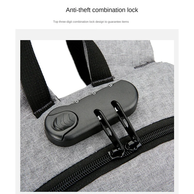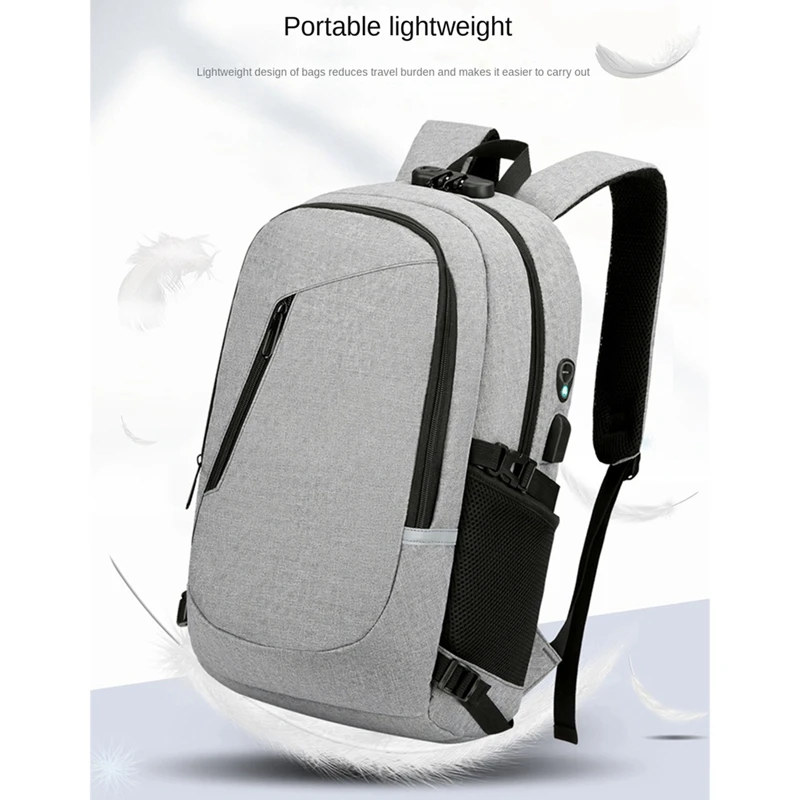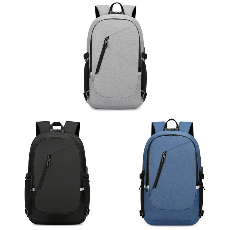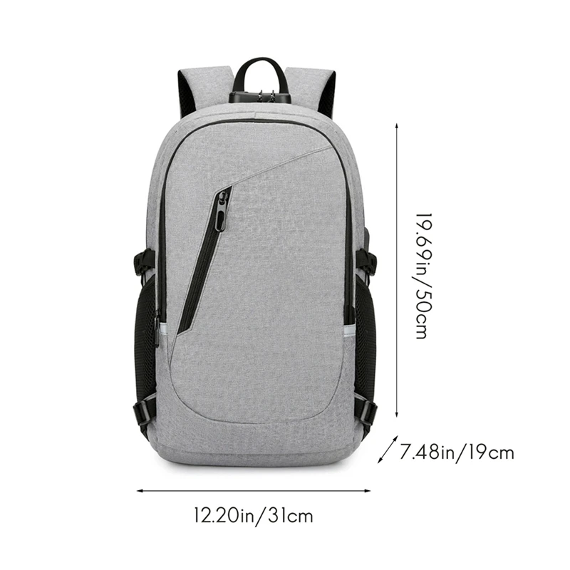 Con función impermeable Gran capacidad interna de la mochila. Interior con compartimento para computadora Correas de hombro con transpirabilidad y amortiguación. Mochila con cierre de combinación antirrobo Descripción: La mochila está confeccionada en tejido Oxford con función impermeable.El interior de la mochila tiene un compartimento para computadora y un divisor, lo que le facilita guardar sus pertenencias.Mochila con cerradura de combinación antirrobo antirrobo de tres dígitos, el uso más seguro, sin miedo a que se fue robado el contenido de la bolsa. Tamaño: 31x19x50cm Material: tela Oxford Color: gris/negro/azul