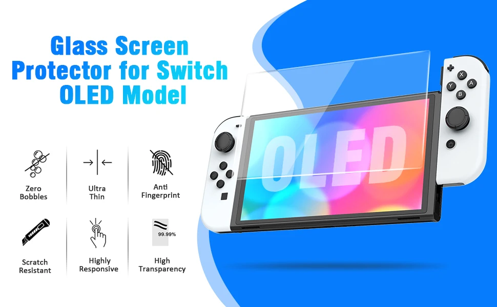 3.Protección total y protector de pantalla premium: HD PET Cobertura total, diseño súper delgado y resistente.El protector de pantalla ofrece la máxima sensibilidad de la pantalla táctil y protege sus ojos.3 pares de tapas de silicona con puntos táctiles para el pulgar, protegen completamente su interruptor durante el juego.