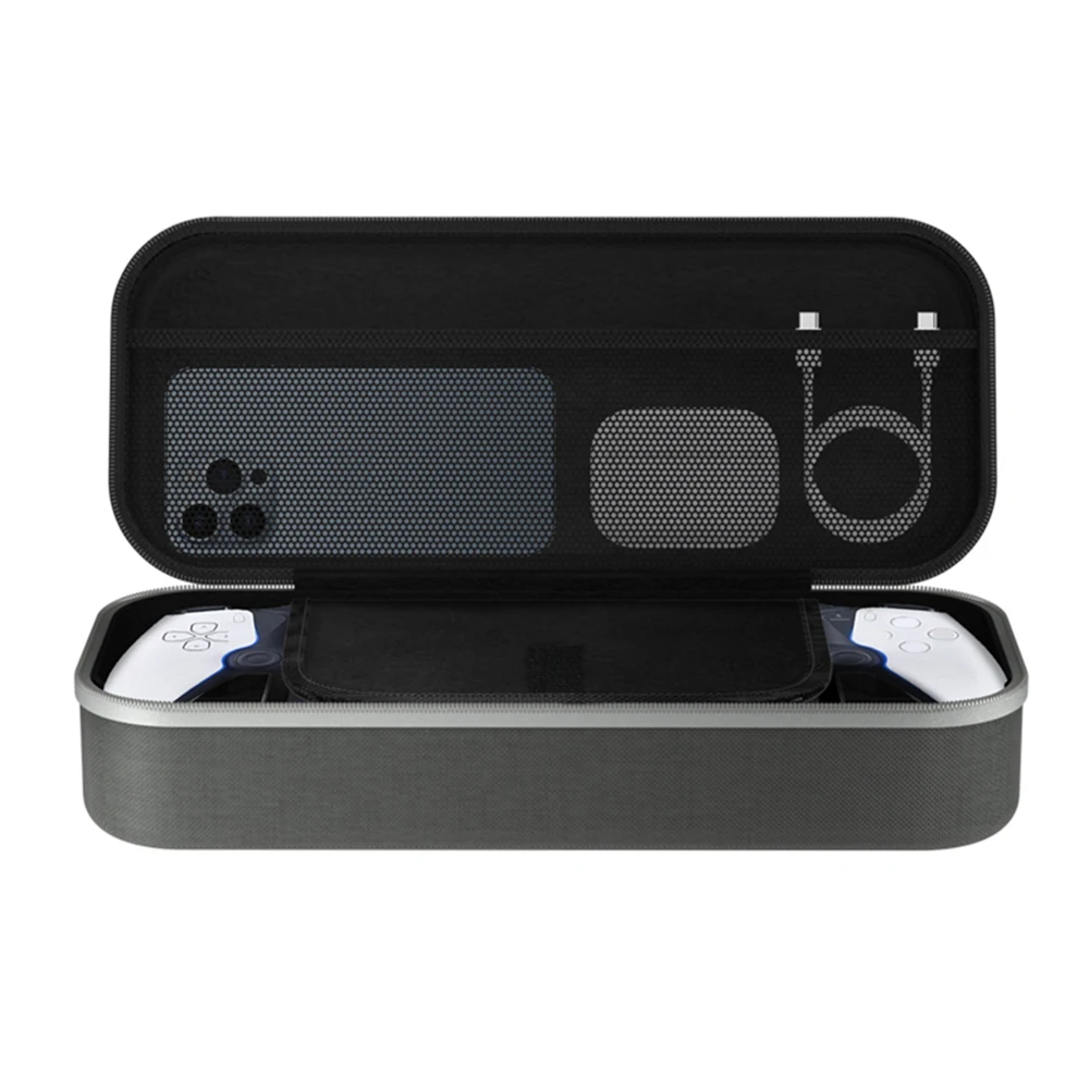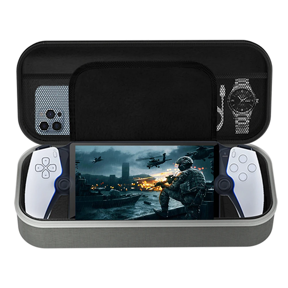 Característica:1. Diseño dedicado:Diseñado específicamente para los jugadores de PS5 PlayStation Portal en movimiento. El estuche de transporte duro presenta un diseño minimalista que ahorra espacio y es cómodo de llevar.2. Material Premium:Hecha de material EVA duradero y forro de terciopelo suave, esta carcasa dura proporciona una excelente protección contra golpes, caídas, arañazos y temblores. Ofrece protección integral para su consola de juegos desde adentro hacia afuera.3. Almacenamiento dividido:El interior del estuche de viaje cuenta con compartimentos dedicados para almacenar de forma segura la consola de juegos, evitando que se aplaste. El bolsillo de malla adicional le permite almacenar accesorios como cables, cargadores, tarjetas SD y más, manteniendo todo organizado y en un solo lugar.4. Soporte integrado:El panel interno de la ranura del estuche rígido protector se puede utilizar como soporte, eliminando la necesidad de comprar uno adicional. Disfrute cambiando al modo de escritorio donde quiera que vaya, perfecto para actividades al aire libre y disfrutar de juegos con familiares o amigos.