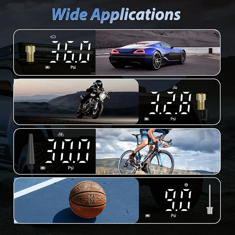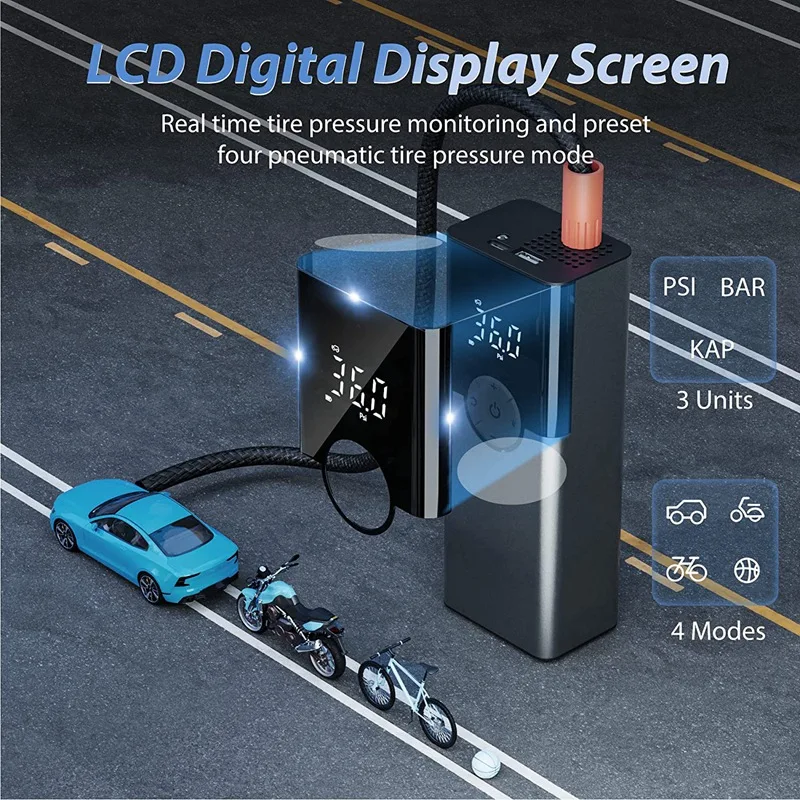 [Cuatro modos de uso y tres unidades de presión de aire] el compresor de aire de la batería tiene 4 modos de funcionamiento, cada uno de los cuales puede inflar coches, motocicletas, bicicletas y varias bolas. Puedes cambiar de modo pulsando brevemente el botón mode. También tiene 3 unidades de presión de aire a saber: Psi, Bar, Kpa, puede cambiar la unidad pulsando prolongadamente el botón de modo.