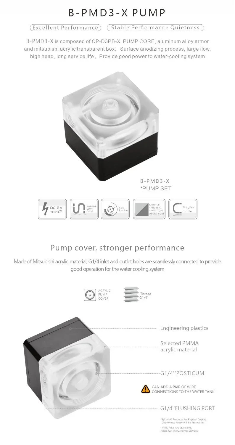 Interfaz de señal: 4 pines + PWMVelocidad de carga: máx. 4800 rpmConsumo de energía de voltaje: DC12V 1,5ADistancia: 6 metrosFlujo máximo: 700L/HLa bomba DDC admite tanque de agua de 50 mm de diámetro