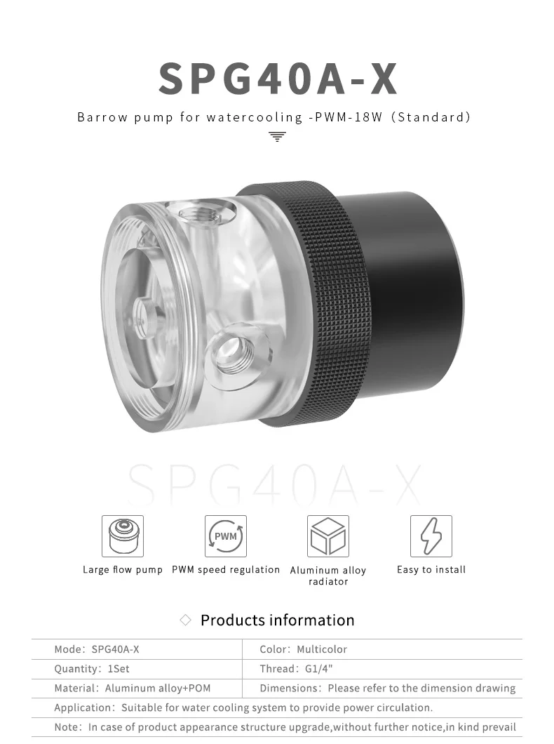 Nota: SPG40A-X para toda la bomba de agua, incluido el núcleo de la bomba, la cubierta de la bomba y la carcasa de aleación de aluminio de cobertura completa, se puede utilizar de forma independiente