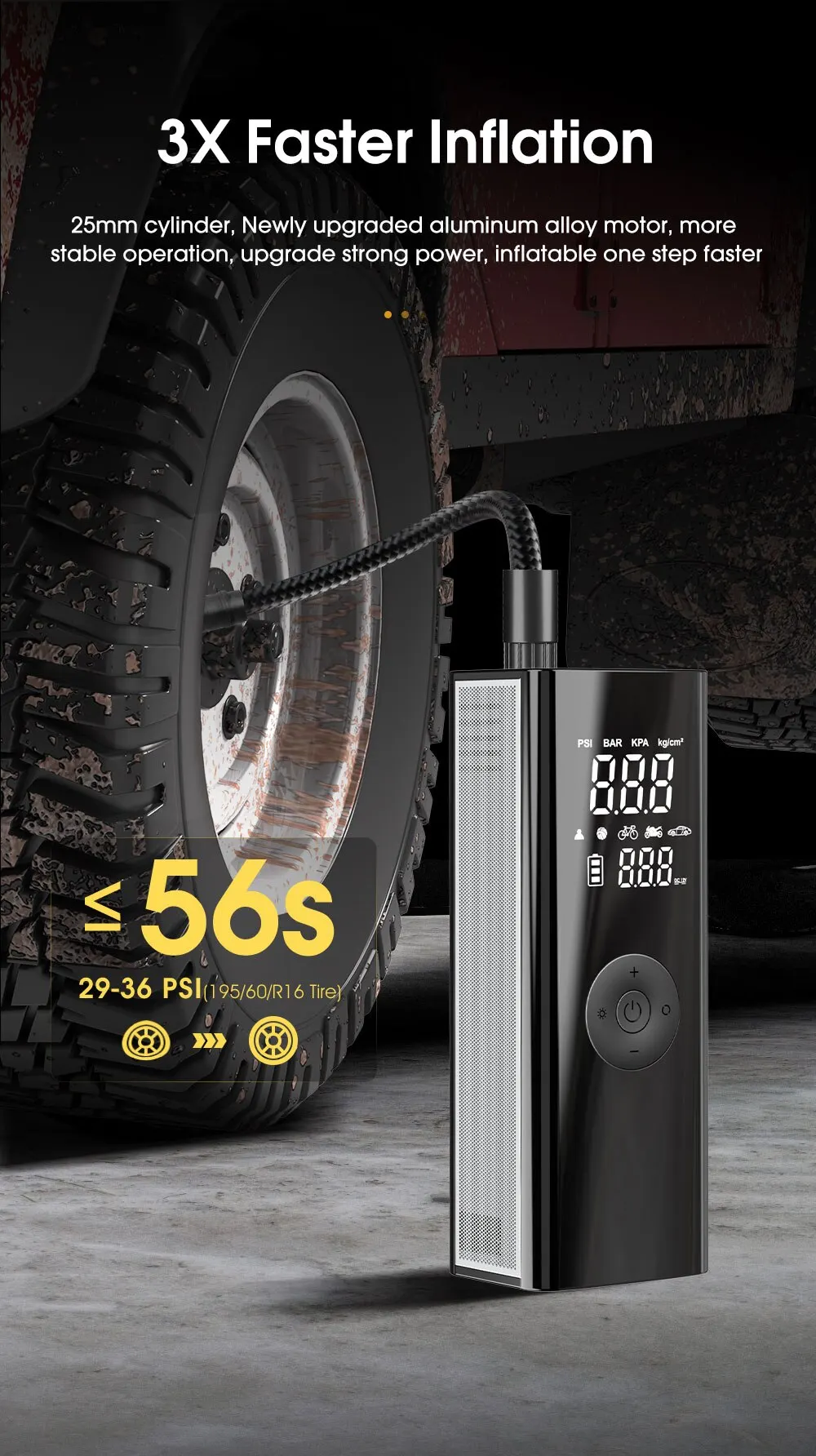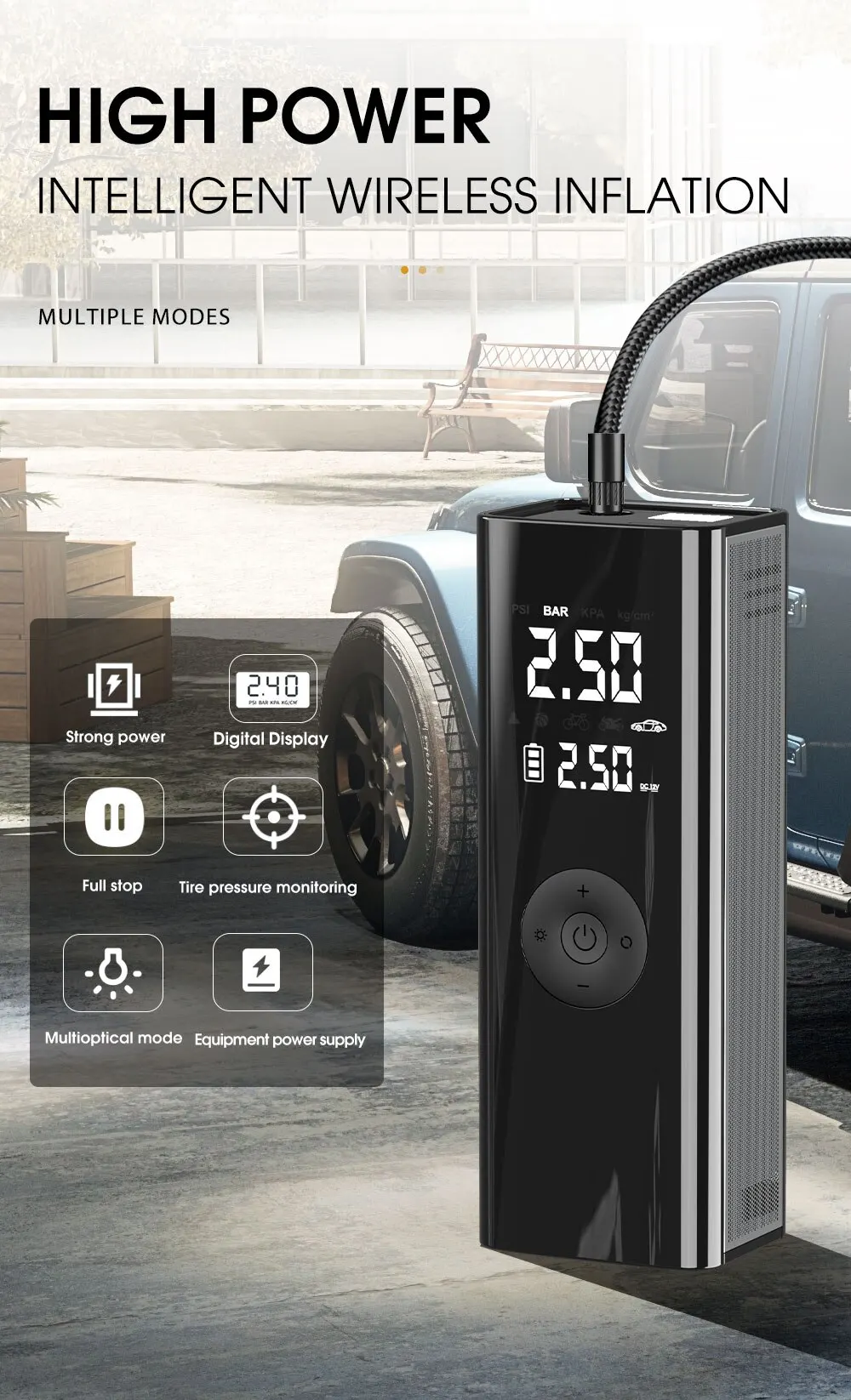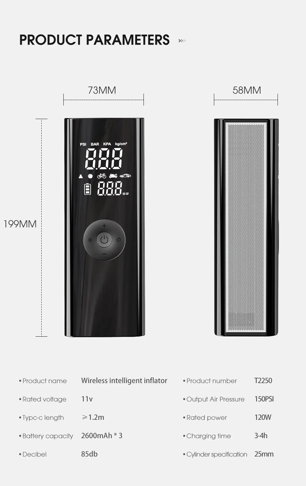 • Batería de alta capacidad :Con una batería de 2600mAh, este inflador puede inflar los neumáticos hasta 150psi sin necesidad de ser enchufado.