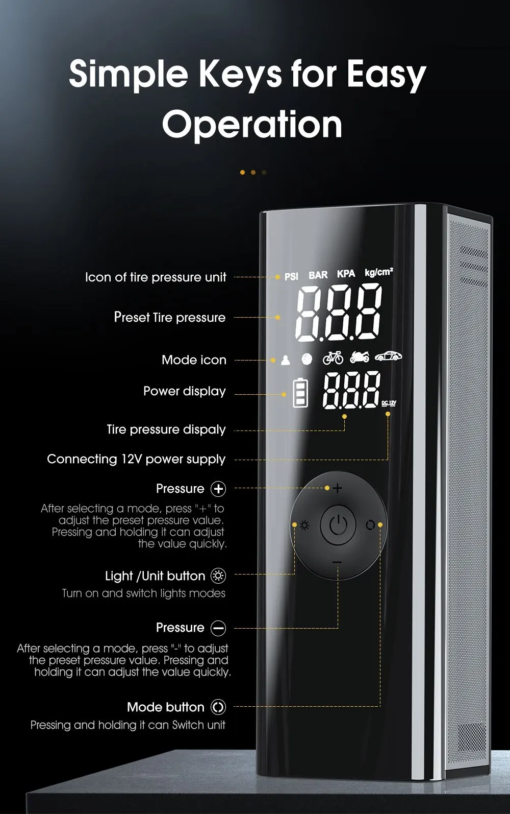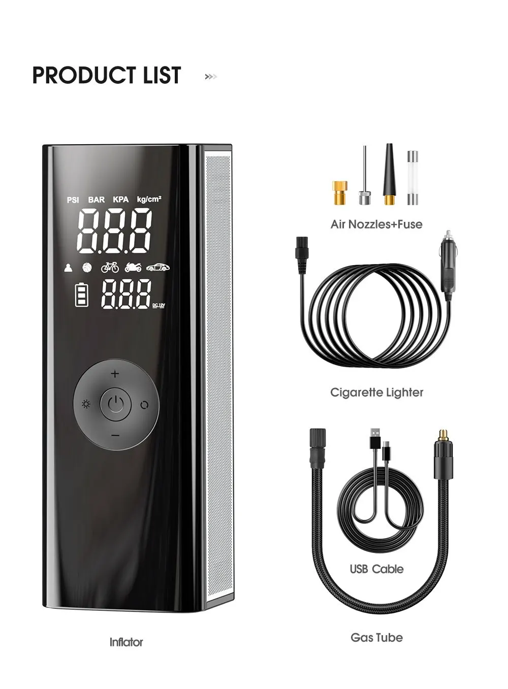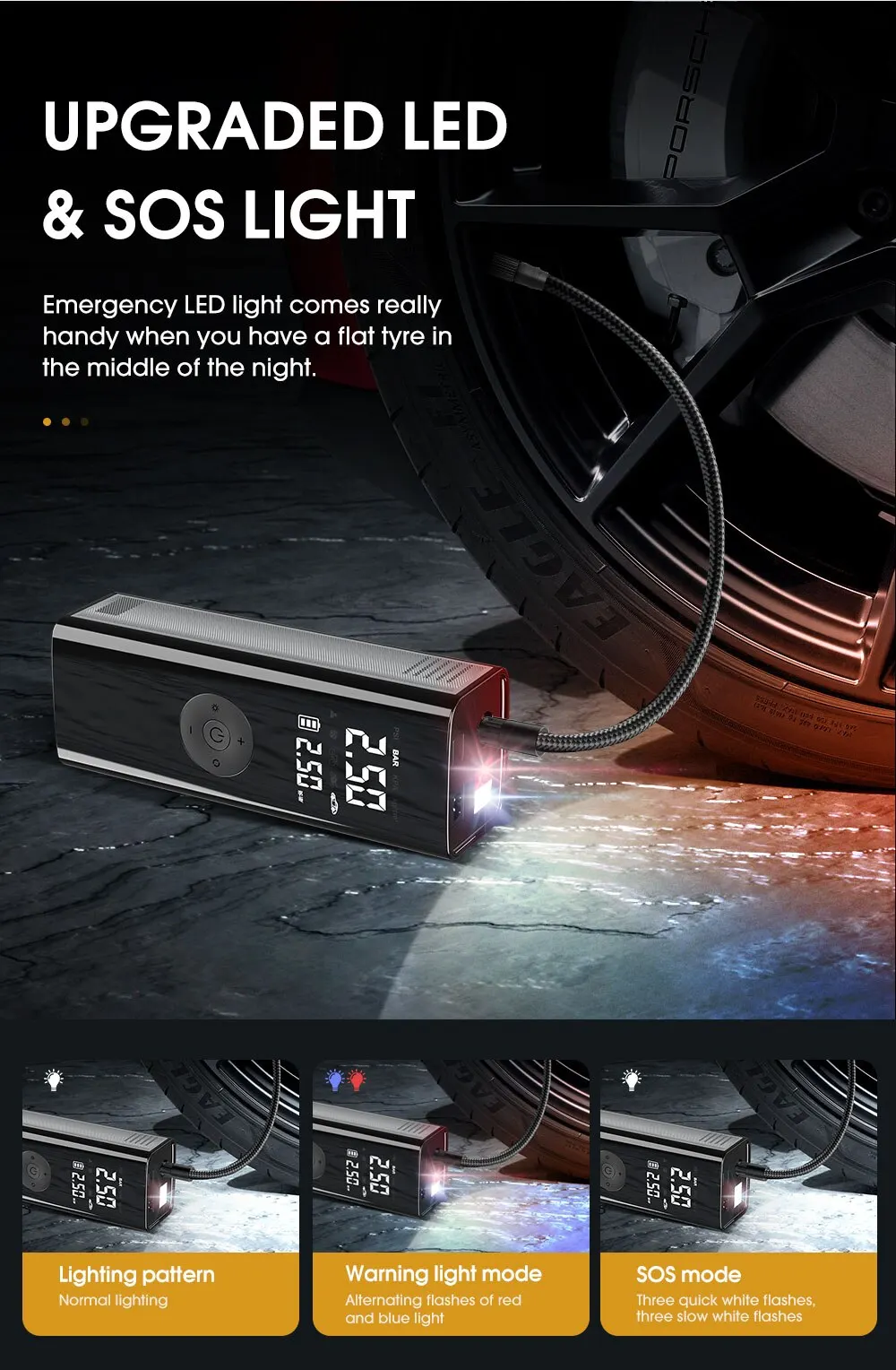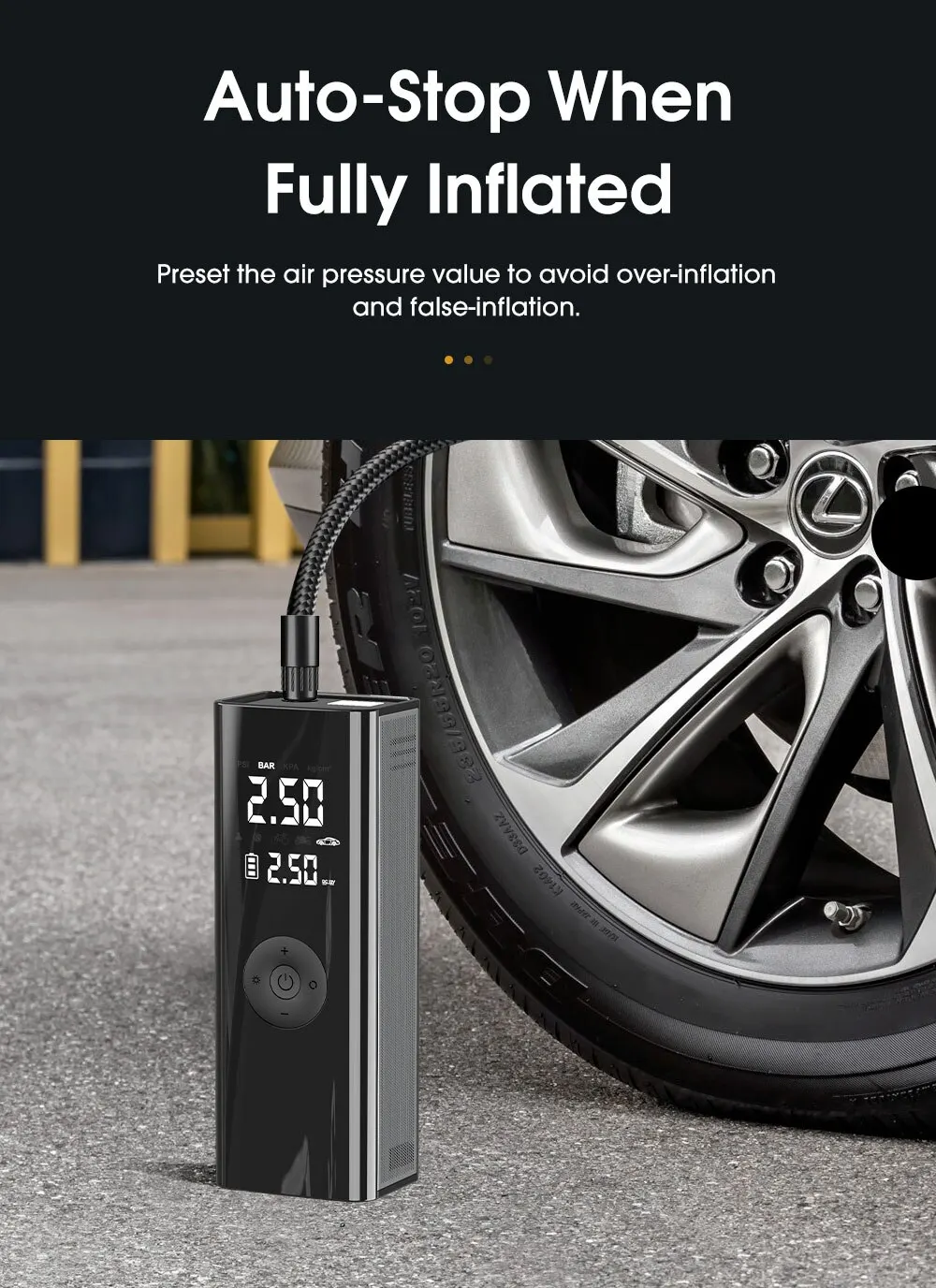 • Batería de alta capacidad :Con una batería de 2600mAh, este inflador puede inflar los neumáticos hasta 150psi sin necesidad de ser enchufado.