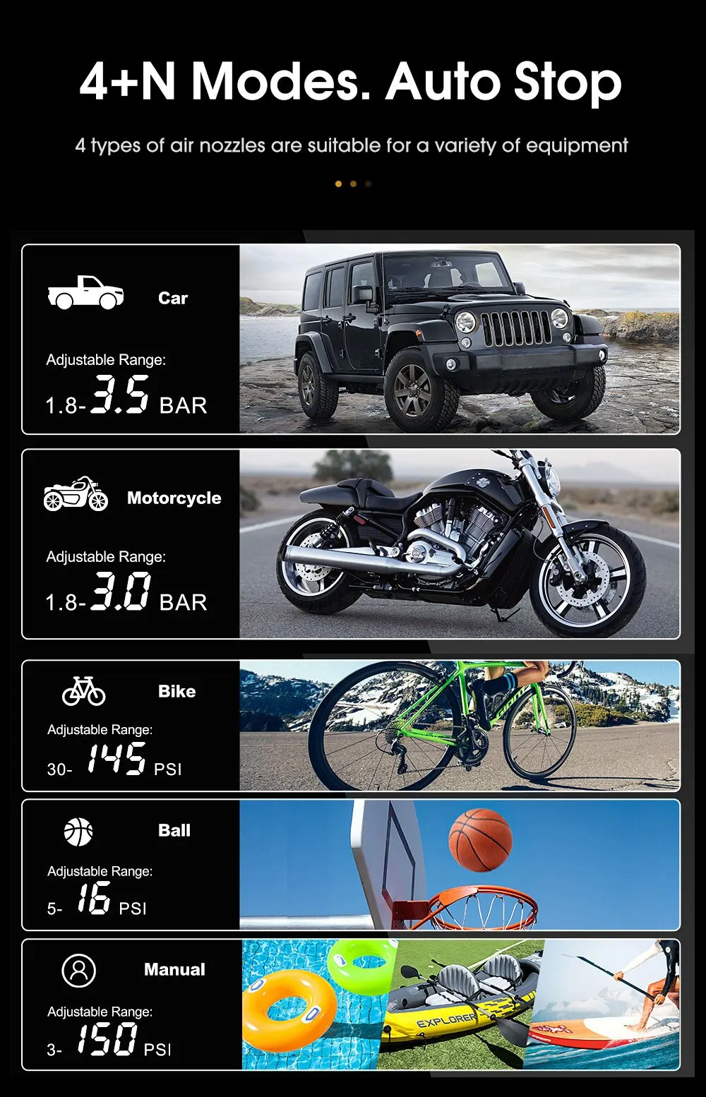 • Compatibilidad versátil :Este inflador es compatible con una variedad de vehículos, incluyendo camionetas, SUV y motocicletas, por lo que es una herramienta versátil para cualquier conductor.