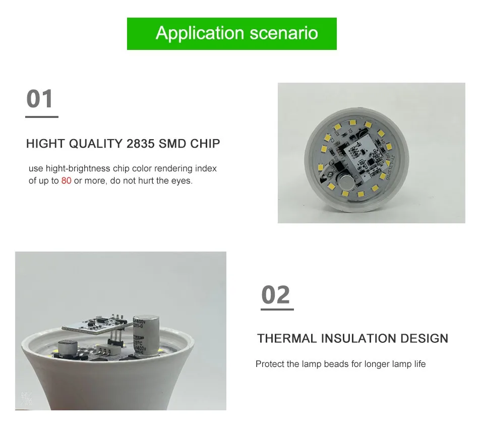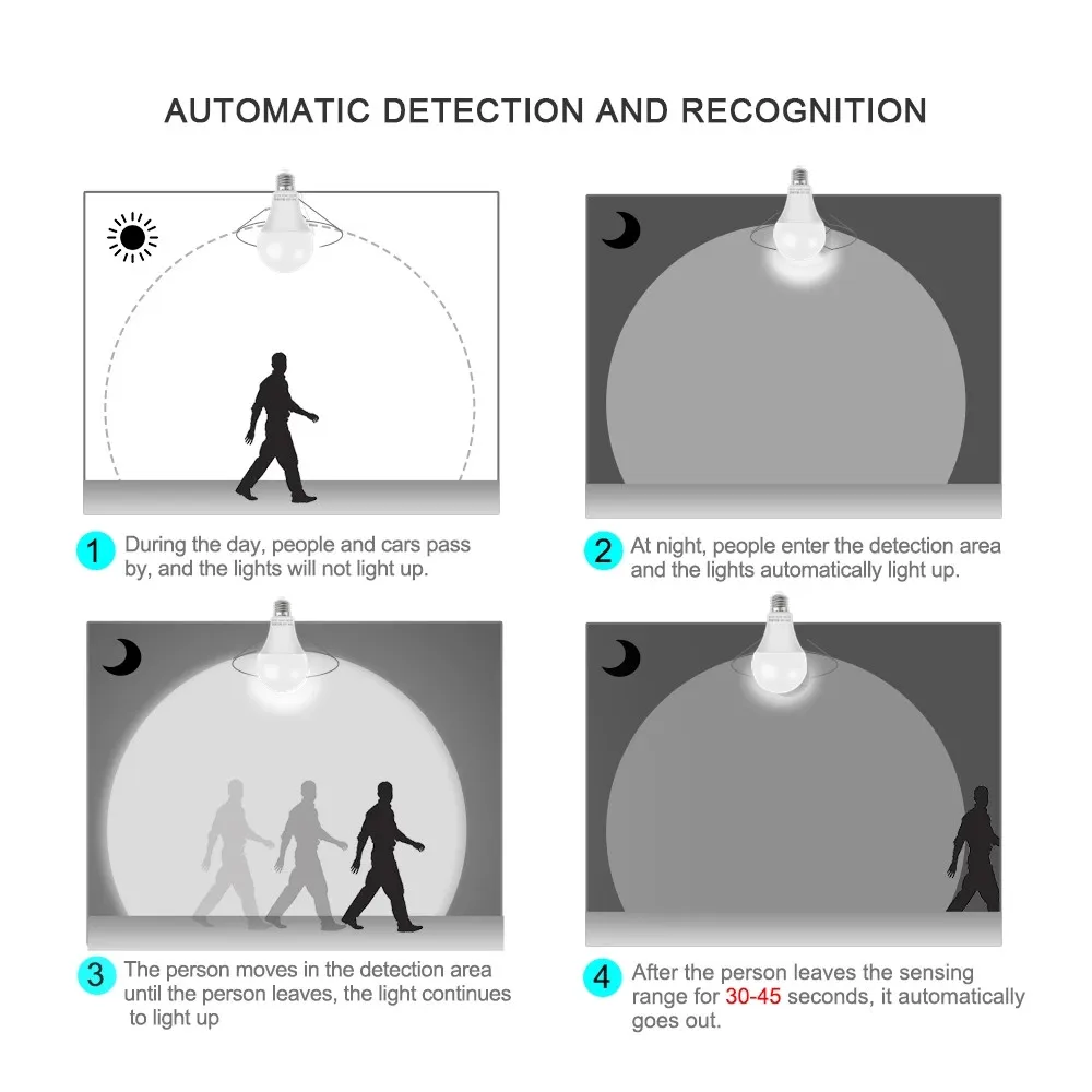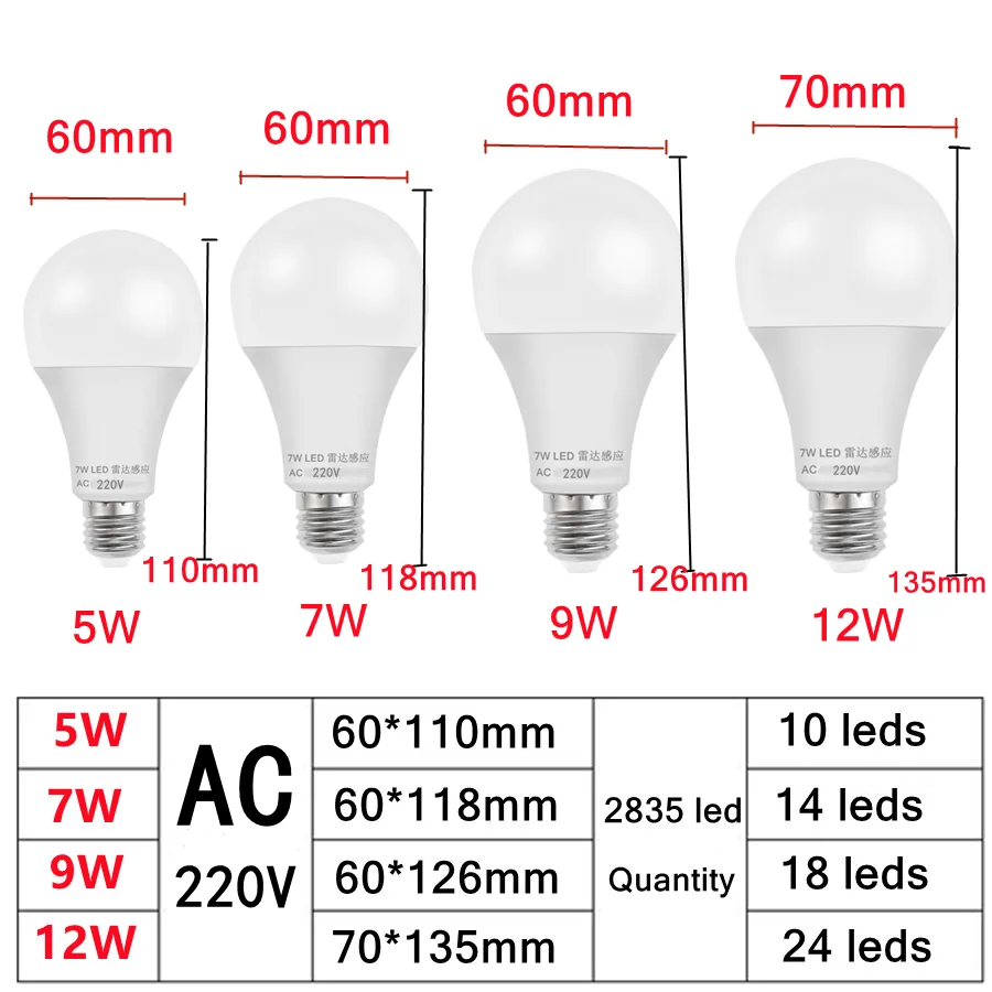 Potencia: 5W 7W 9W 12W Color de emisión: blanco frío K 6000, Blanco cálido 3000K Material del cuerpo: PC + ABS Ángulo de detección: 120 grados Distancia de detección: 5-8 metros Tiempo de duración: 40s Características: 1. [DETECCIÓN DE RADAR] -- Adopte la tecnología avanzada de detección de radar, que es más sensible y más penetrante que los sensores infrarrojos. La bombilla del sensor de radar puede detectar movimiento al otro lado de la pared (el grosor de la pared debe ser inferior a 8 pulgadas). Por lo tanto, se encenderá cuando detecte cualquier objeto en movimiento y se apagará automáticamente después de no moverse durante 30-40s. (NOTA: Después de instalar la bombilla, encienda el interruptor de pared para mantenerla encendida, se iluminará en la oscuridad). 2. [AHORRO DE ENERGÍA] -- La bombilla LED inteligente solo ilumina en la oscuridad y al anochecer detecta movimiento y deja de funcionar durante el día. La bombilla LED es más eficiente energéticamente que las bombillas tradicionales con sensor de movimiento, lo que ayuda en gran medida a reducir su carga de energía. Este diseño aumenta la vida útil. 3. [AMPLIA APLICACIÓN] -- La bombilla del sensor de radar es adecuada para instalar en el dormitorio, baño, escaleras, pasillo, patio, puerta de entrada, etc. Proporciona luz blanca brillante y evita tropiezos en la oscuridad Paquete: 1 bombilla LED con sensor de radar