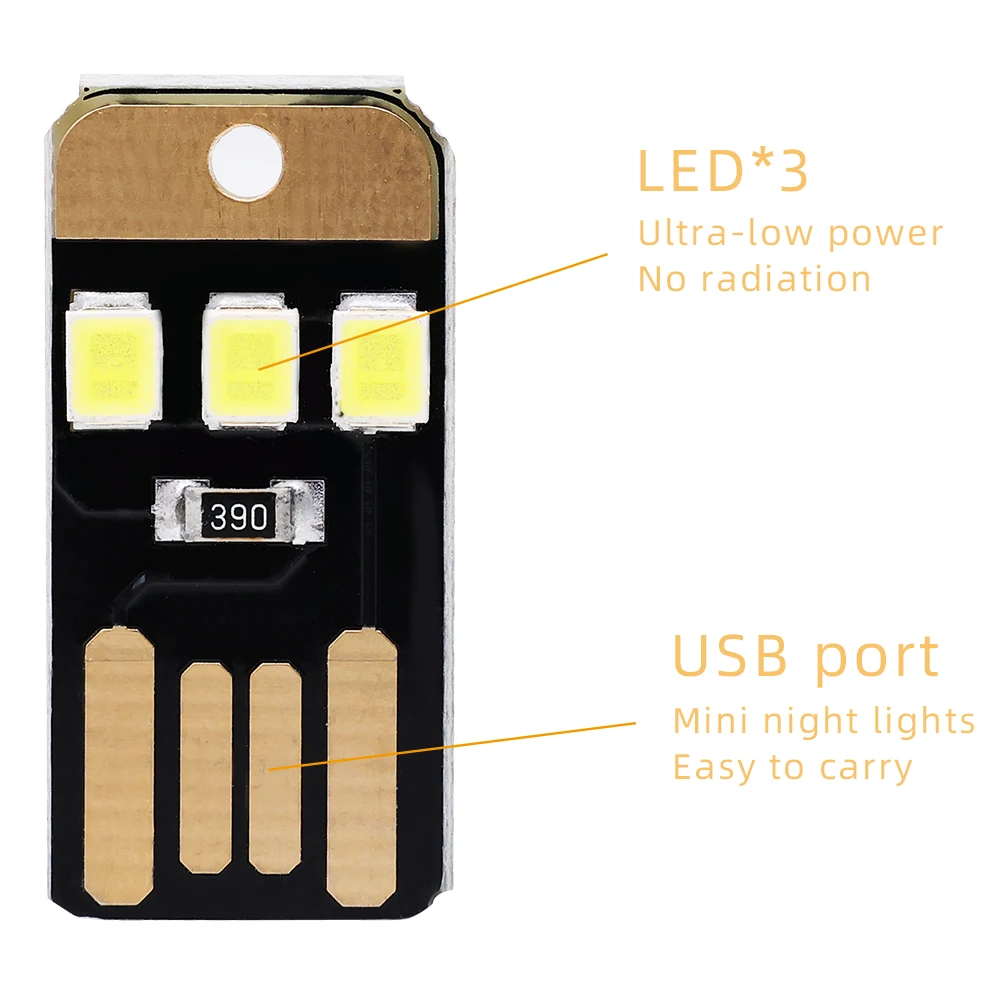 Especificación: 1. Nombre del producto: luz LED USB para acampar al aire libre 2. de LEDs Número: 3 x parche 2835 3. Brillo: 22LM 4. Color de luz opcional: blanco 5. Alimentación: USB 6. Potencia: 0,2 W 7. Tamaño del producto: 24,3mm x 11,7mm 8. Material: PCBA