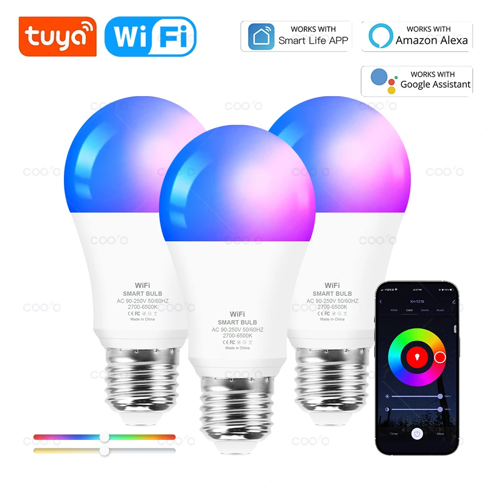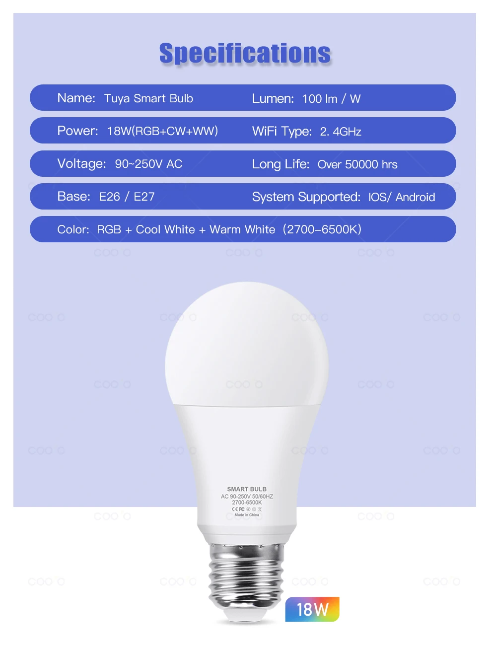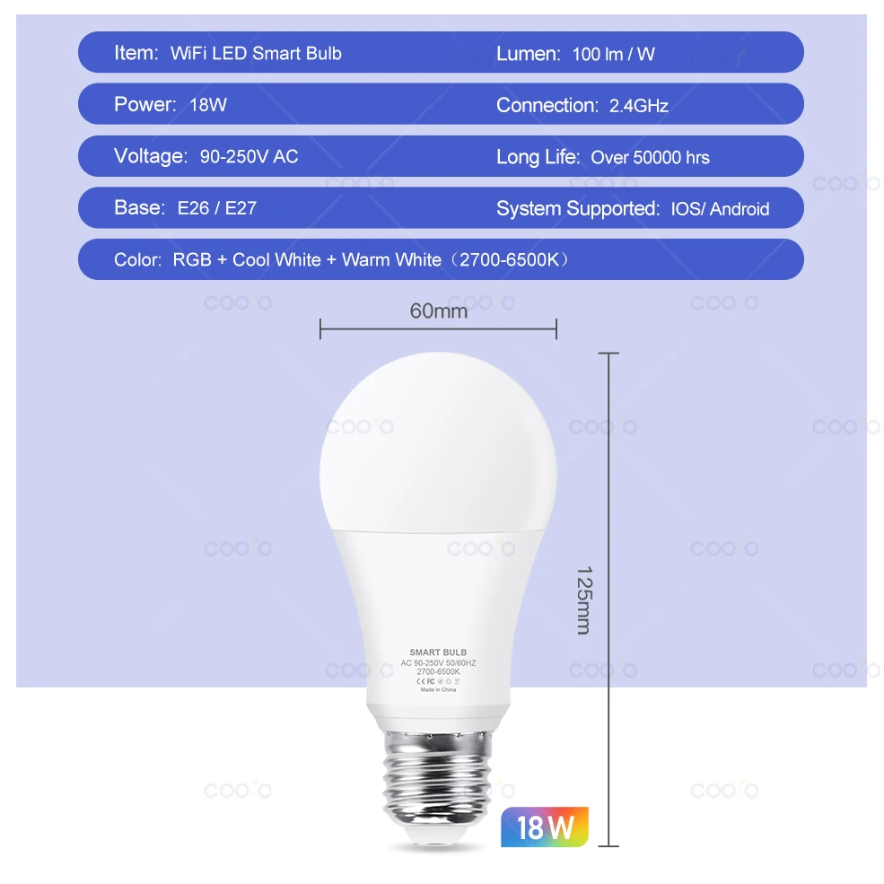 Comprar Bombilla WiFi inteligente Tuya E27 18W RGB CW WW bombilla Compatible con Google Home Alexa para decoración del hogar inteligente