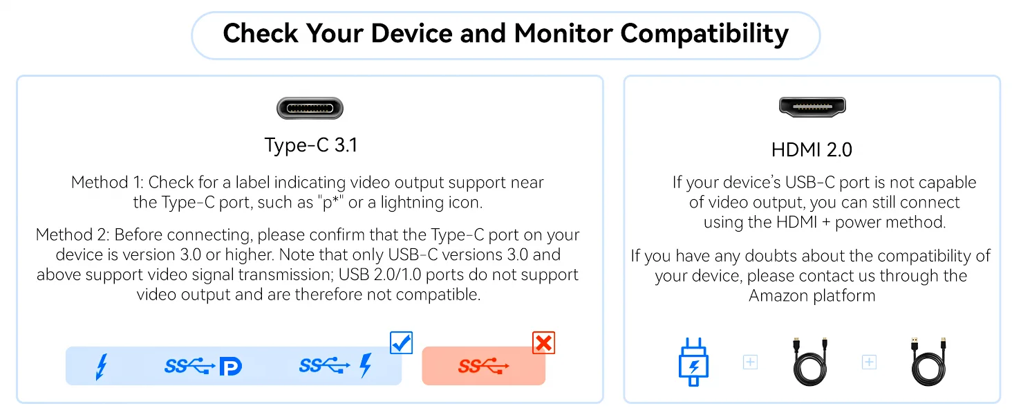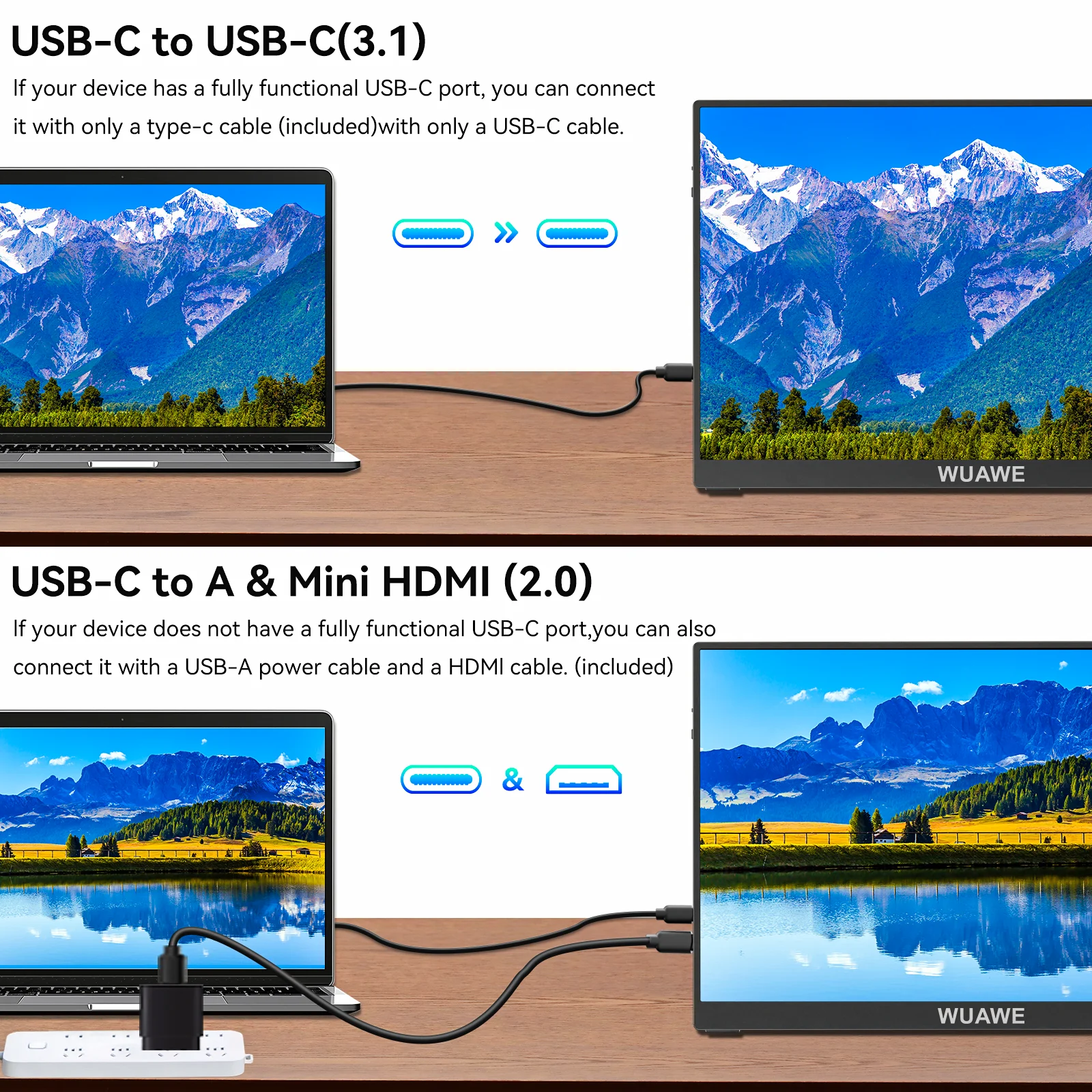 [ AMPLIA COMPATIBILIDAD ]: Monitor portátil WUAWE para computadora portátil equipado con 2 puertos USB tipo C y puerto Mini-HDMI, fácil acceso a sus dispositivos favoritos con una solución de cable siempre que su dispositivo sea compatible con Thunderbolt 3 o 3.1 USB-Type-C, compatible con la mayoría de portátiles, teléfonos inteligentes, PC, PS4, XBOX o Nintendo Switch, y más.