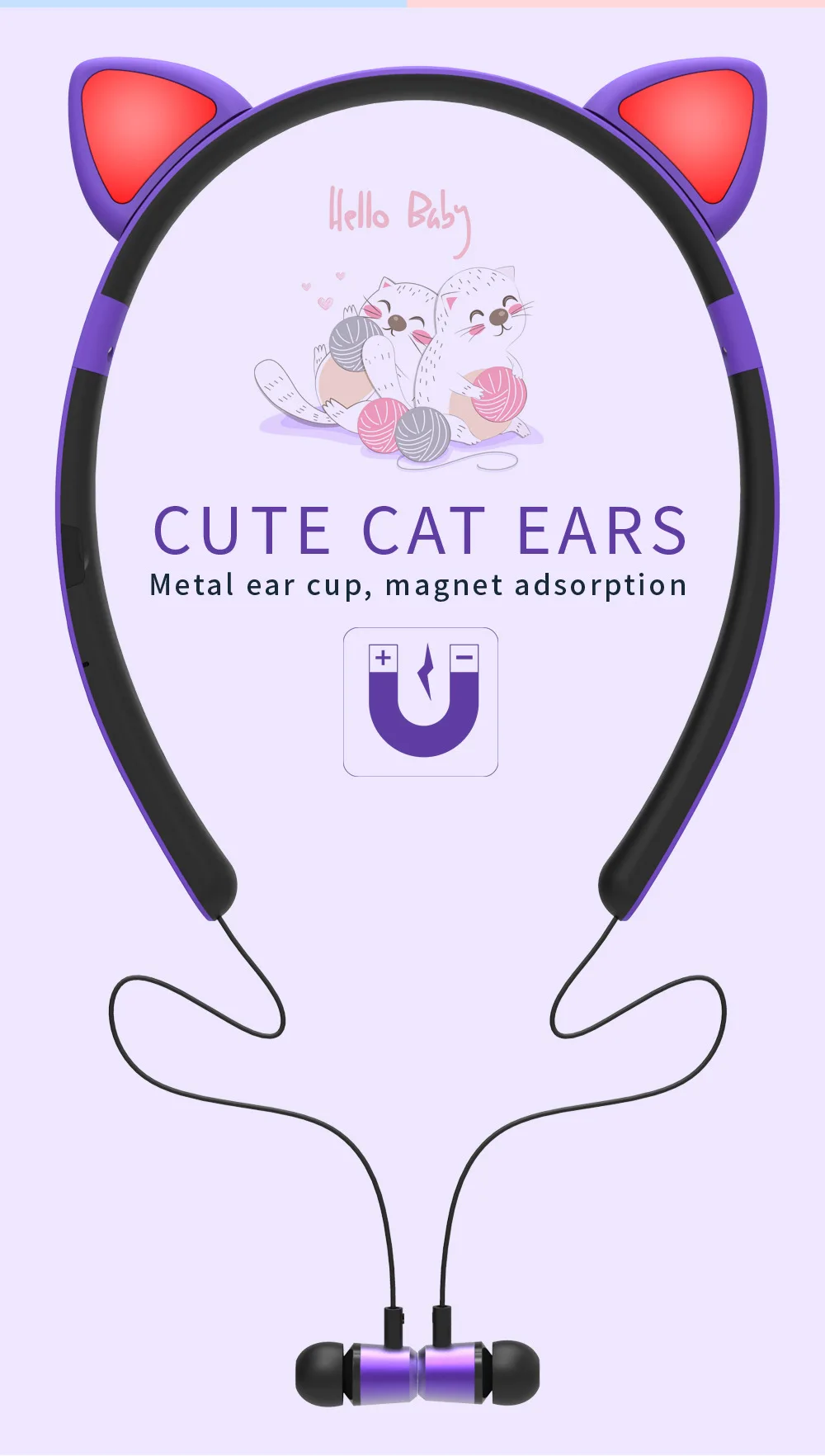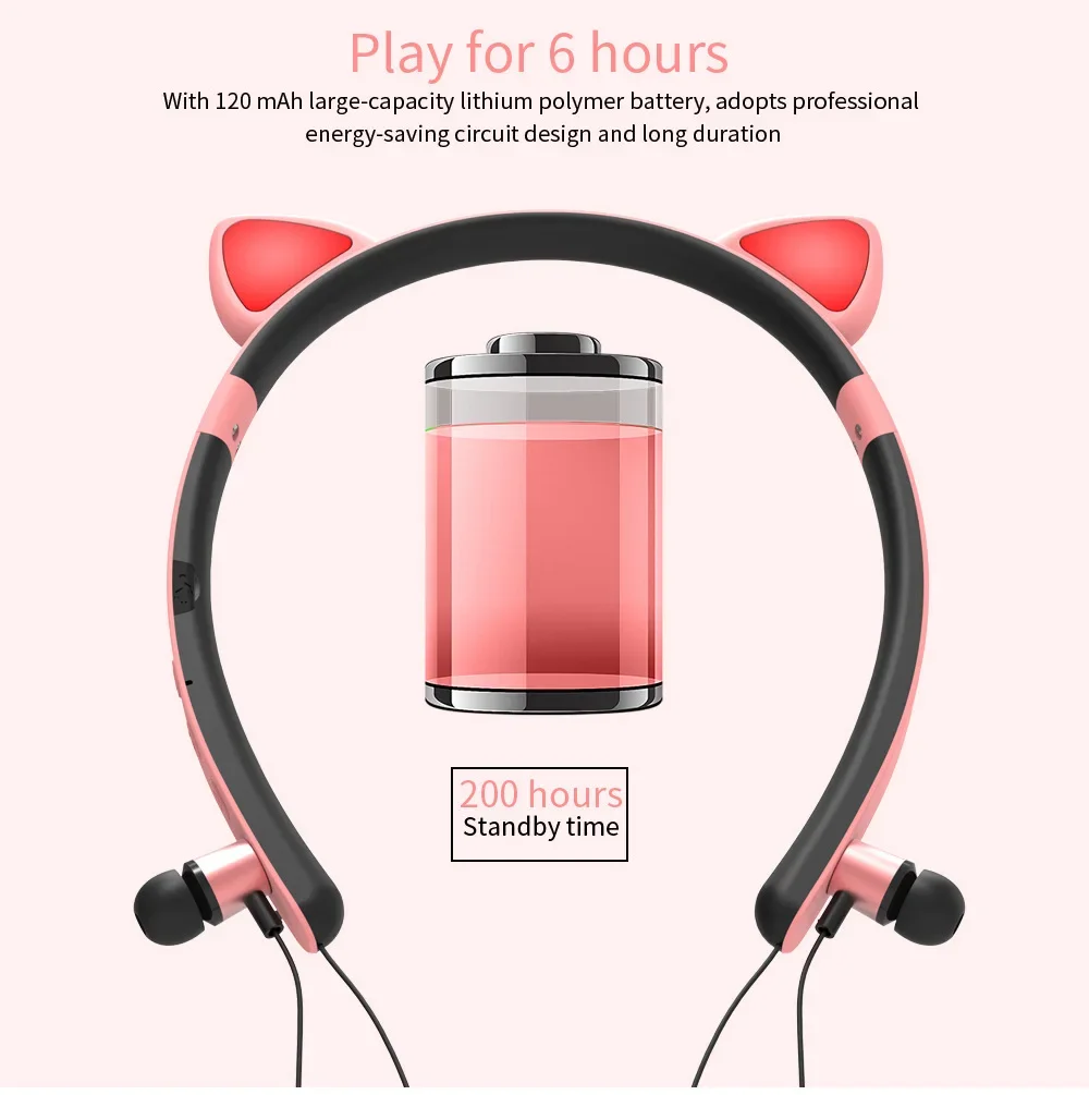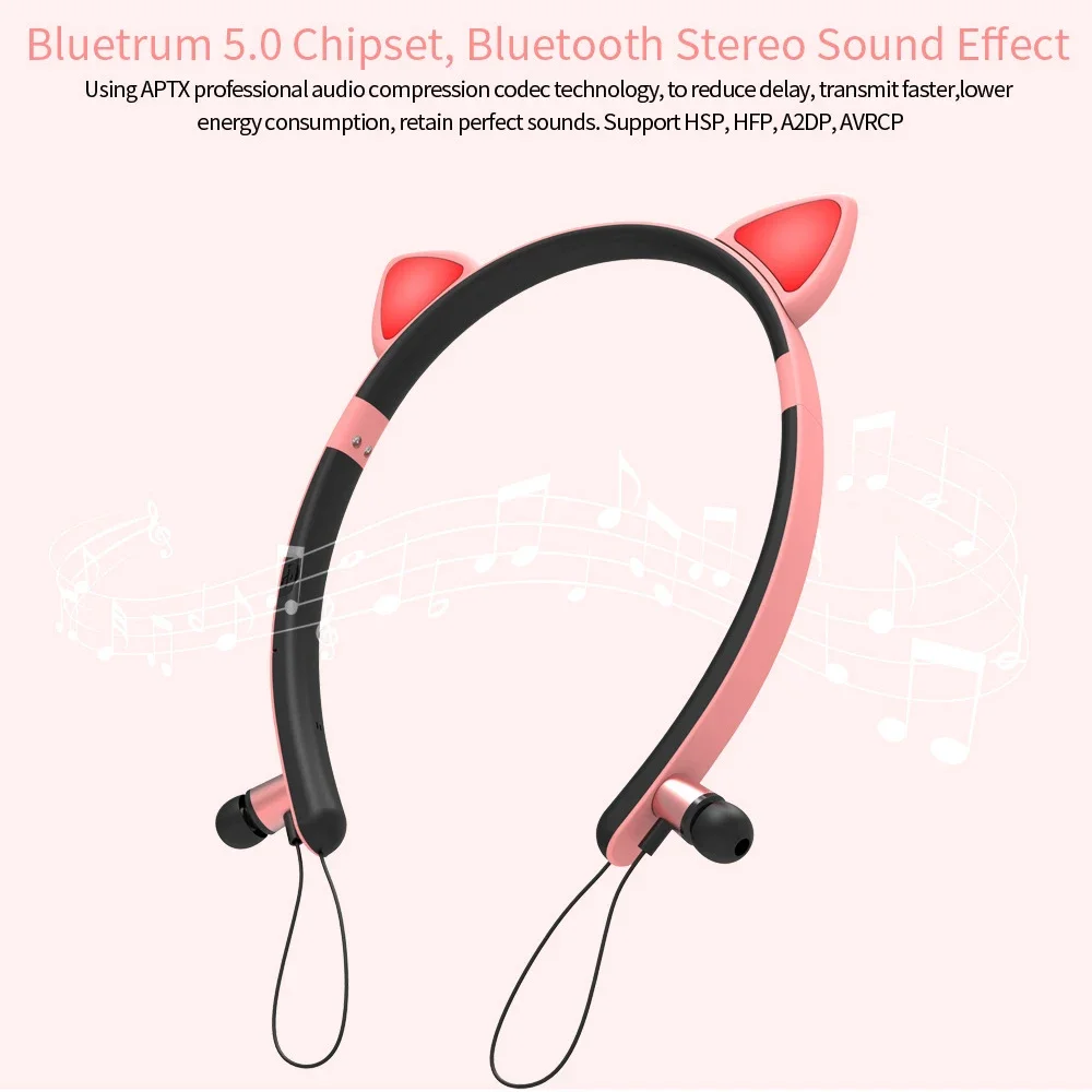 Lindos auriculares inalámbricos con orejas de gato, Bluetooth brillante, auriculares colgantes para el cuello, auriculares deportivos de música de alta fidelidad con micrófono para teléfono con almohadilla
