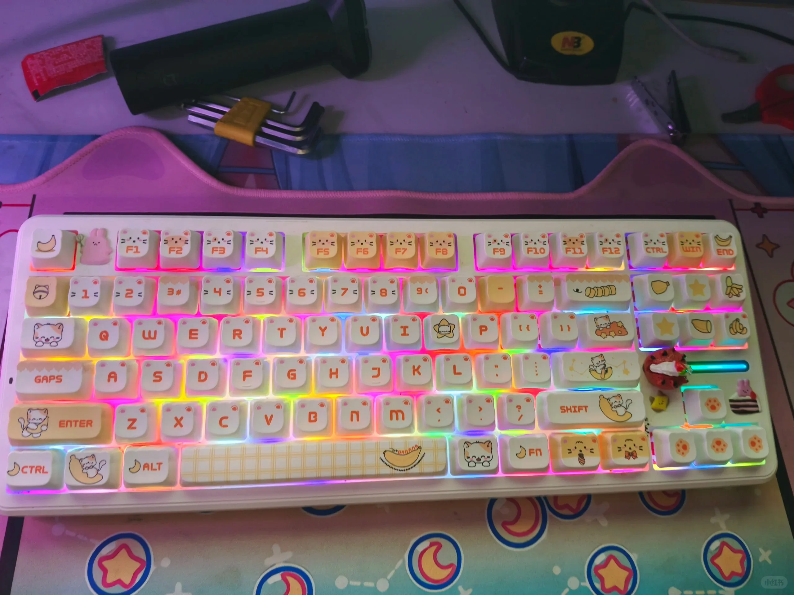 El alto contenido de PBT se considera el mejor material para las teclas. Se puede utilizar durante mucho tiempo, sin deformación, sin brillo.