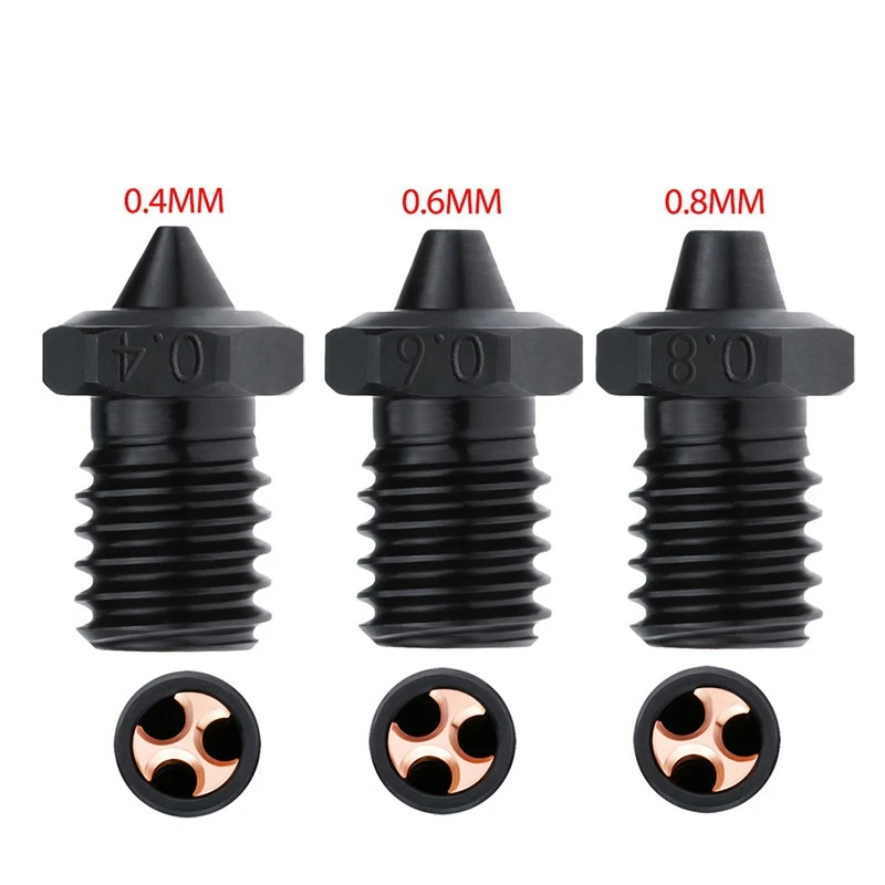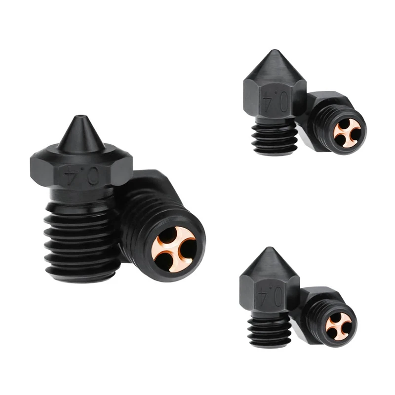 Con tres agujeros, el caudal del filamento es el doble que el de las boquillas normales, lo que le permite imprimir a alta velocidad. Reemplace la boquilla V6 de Puyong con una boquilla CHT para lograr el efecto de una boquilla volcánica.