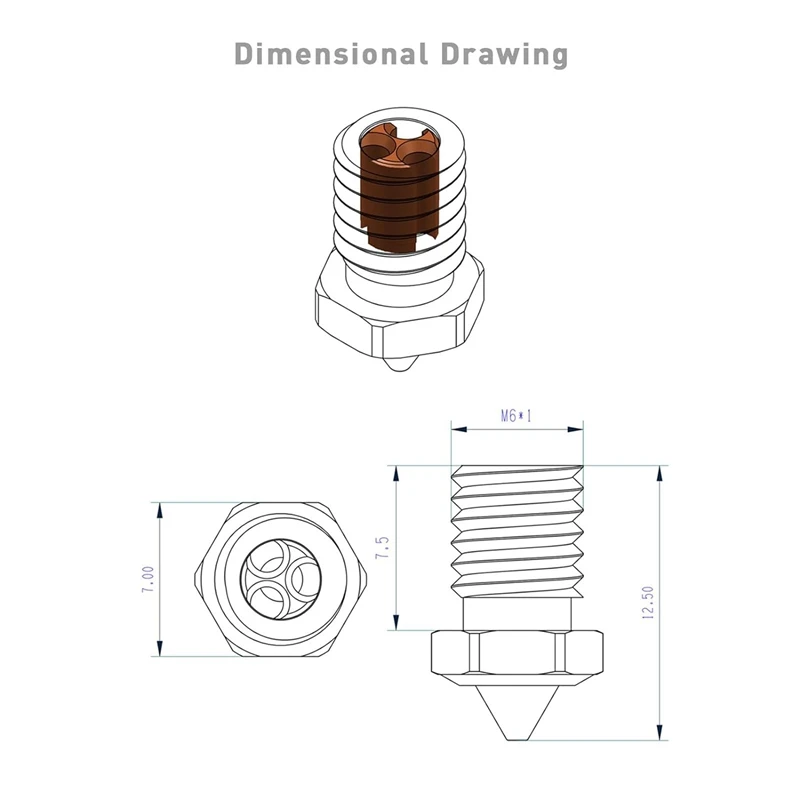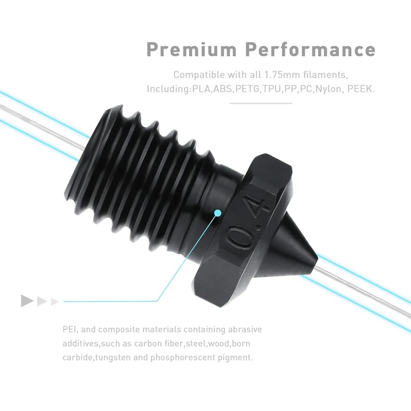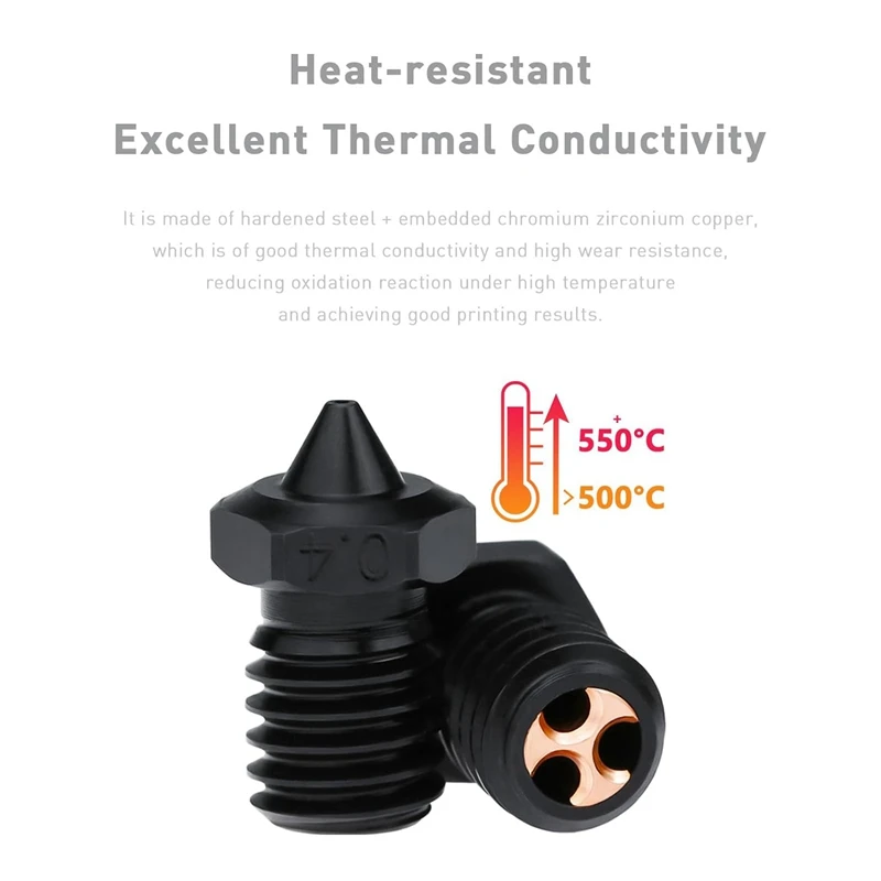 La boquilla de acero endurecido clon CHT puede aumentar el caudal y garantizar una extrusión suave de filamentos de alta calidad sin obstrucciones. El material de acero endurecido es resistente a altas temperaturas y al desgaste, y la vida de impresión más corta es de aproximadamente 50 gramos de filamento de fibra de carbono.
