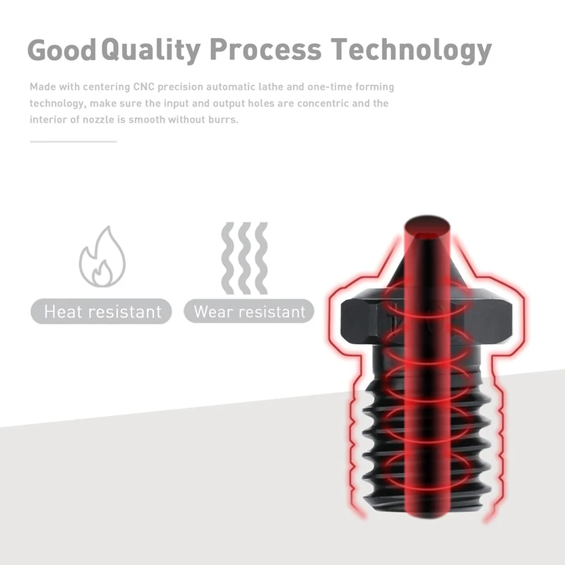 Alta precisión, la superficie interior de la boquilla es lisa y sin rebabas, y la cara del extremo plano de la boquilla hace que sea más fácil de combinar con los elementos calefactores, que puede evitar eficazmente que el filamento se filtre por el extremo de calentamiento y reducir el riesgo de obstrucción.