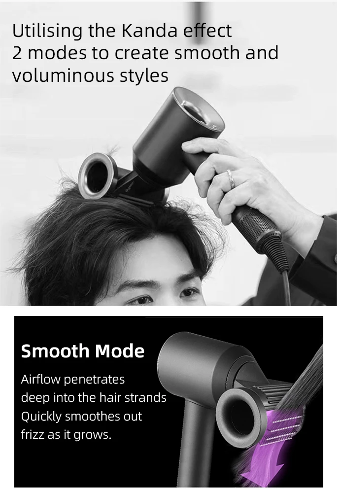 Características de los modos de desenredar y anti-flyback Cabello seco rápido mientras domesticar el frizz para un look brillante. Crear estilos suaves y esponjosos con 2 modos de Efecto Coanda