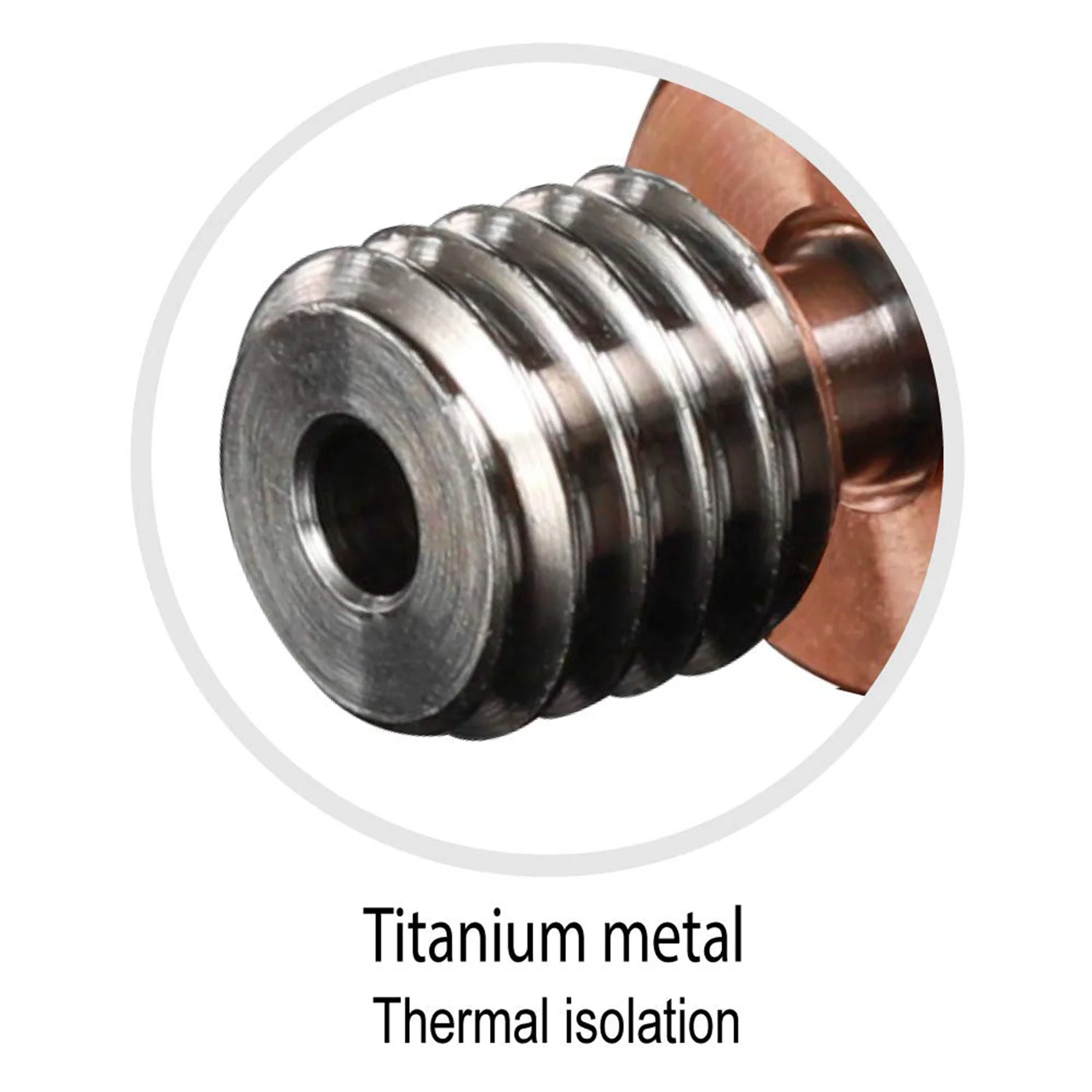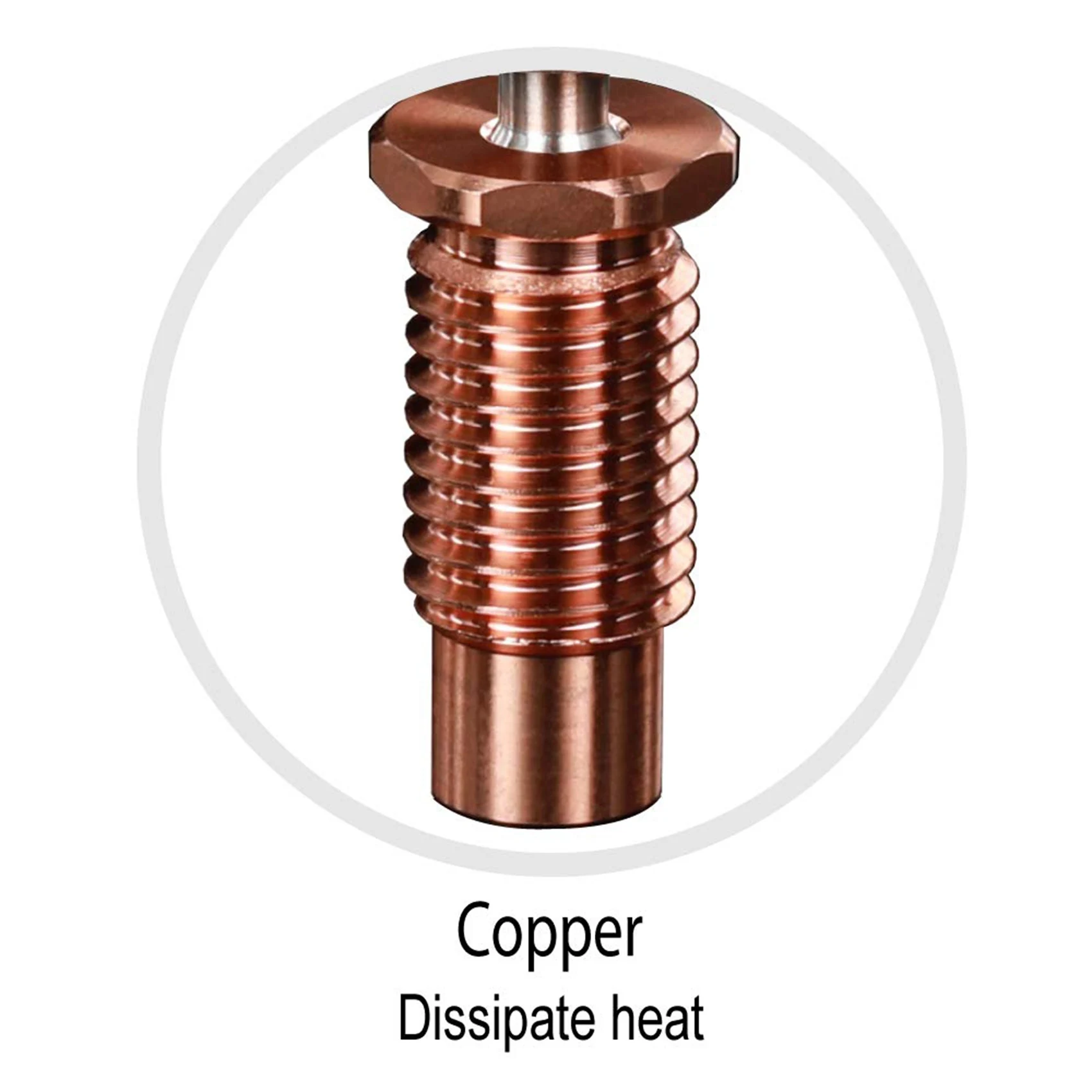 Este producto está compuesto por dos metales, titanio y cobre. El titanio reduce la conducción ascendente del calor en la posición de calentamiento y utiliza cobre para la disipación del calor para acelerar la conducción de calor. El rendimiento supera al OEM para E3D Heatbreak