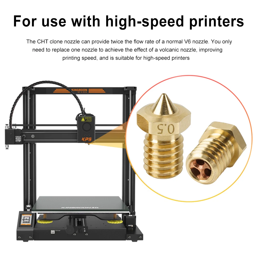 2. Boquilla CHT Clone:Esta boquilla CHT Clone puede entregar el doble de caudal que una boquilla V6 normal. Solo necesita reemplazar una boquilla para lograr el efecto de una boquilla volcánica, aumentando la velocidad de impresión. Es perfecto para impresoras de alta velocidad. Para mejorar su eficiencia de impresión, ahorro de energía y protección del medio ambiente. Es muy adecuado para muchas impresoras 3D.