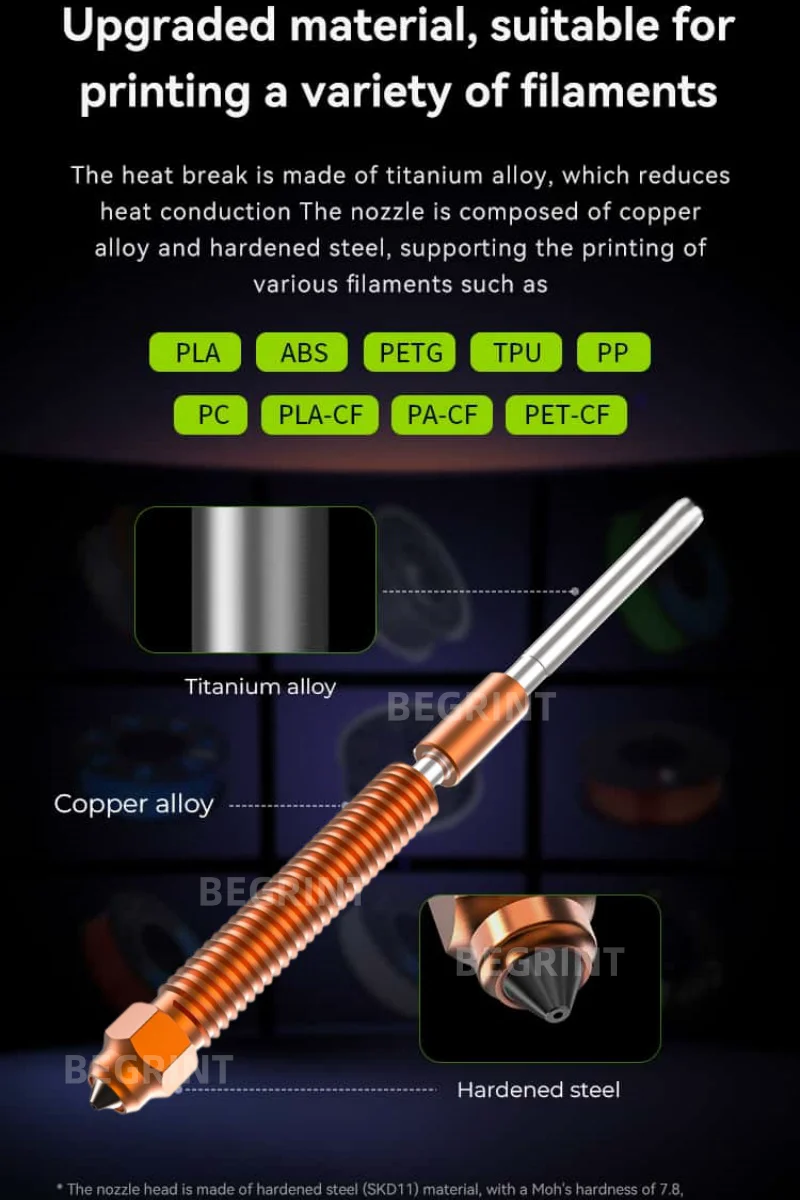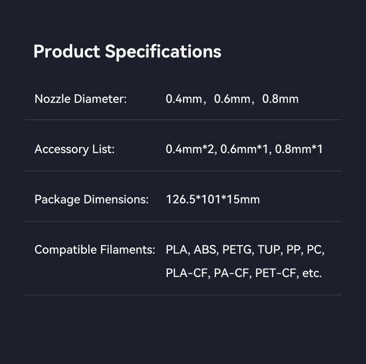 Wide Application - The heat break is made of titanium alloy, which reduces heat conduction The nozzle is composed of copper alloy and hardened steel, supporting the printing of various filaments such as PLA, ABS, PETG, TPU, PP, PC, PLA-CF,PA-CF, PET-CF, etc.