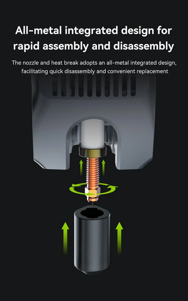 All-metal integrated design - The nozzle and heat break adopts an all-metal integrated design,facilitating quick disassembly and convenient replacement.