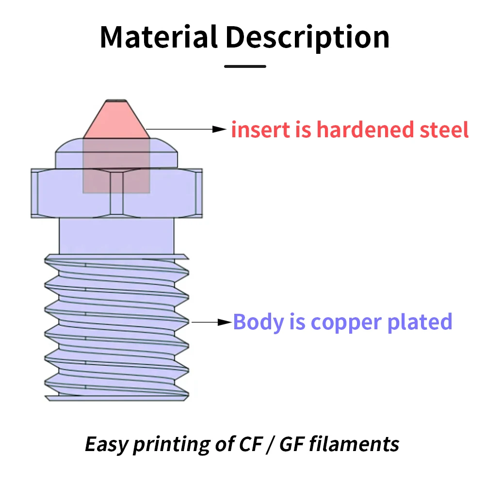 En la punta de la boquilla, utilizamos material de acero endurecido junto con un tratamiento Diamond-Like Carbon (DLC).Esto aumenta la dureza y la resistencia al desgaste de la boquilla, especialmente al imprimir materiales abrasivos de fibra de carbono.