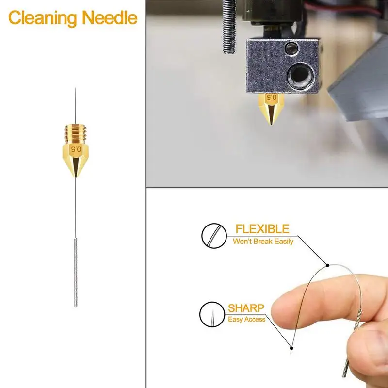 3. Uso conveniente: mantenga su impresora 3D en buenas condiciones sin esfuerzo.Nuestra boquilla cuenta con 10 agujas de limpieza de acero inoxidable que son flexibles y resistentes.No es necesario desmontarlo, simplemente use las agujas para eliminar obstrucciones duras en la boquilla del extremo caliente del extrusor.Disfrute de mejoras significativas en la eficiencia de la producción con facilidad