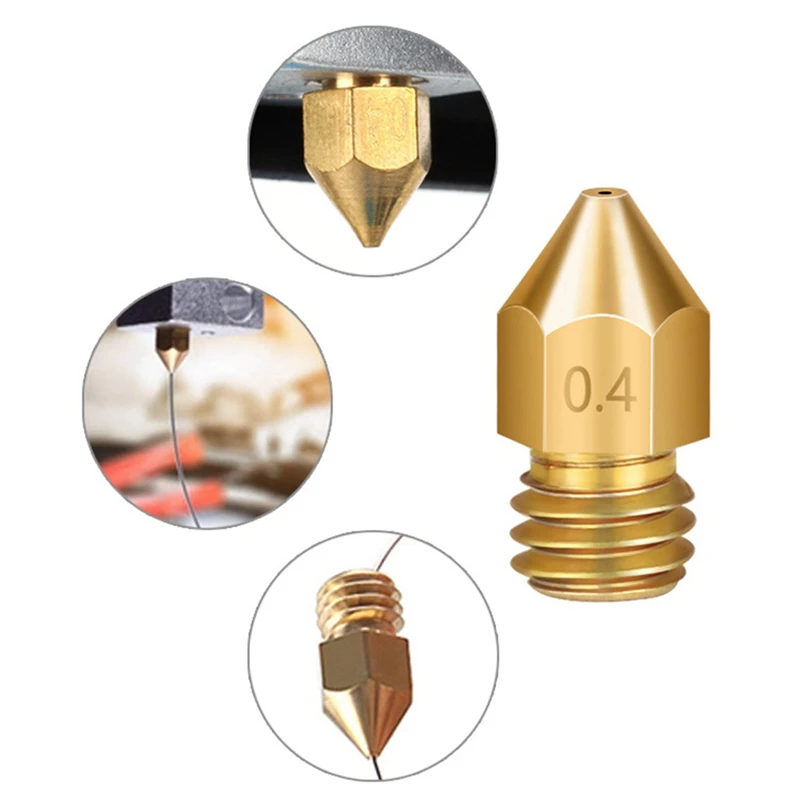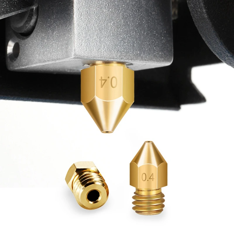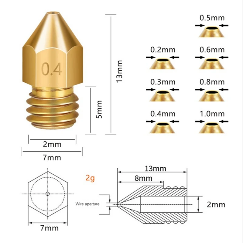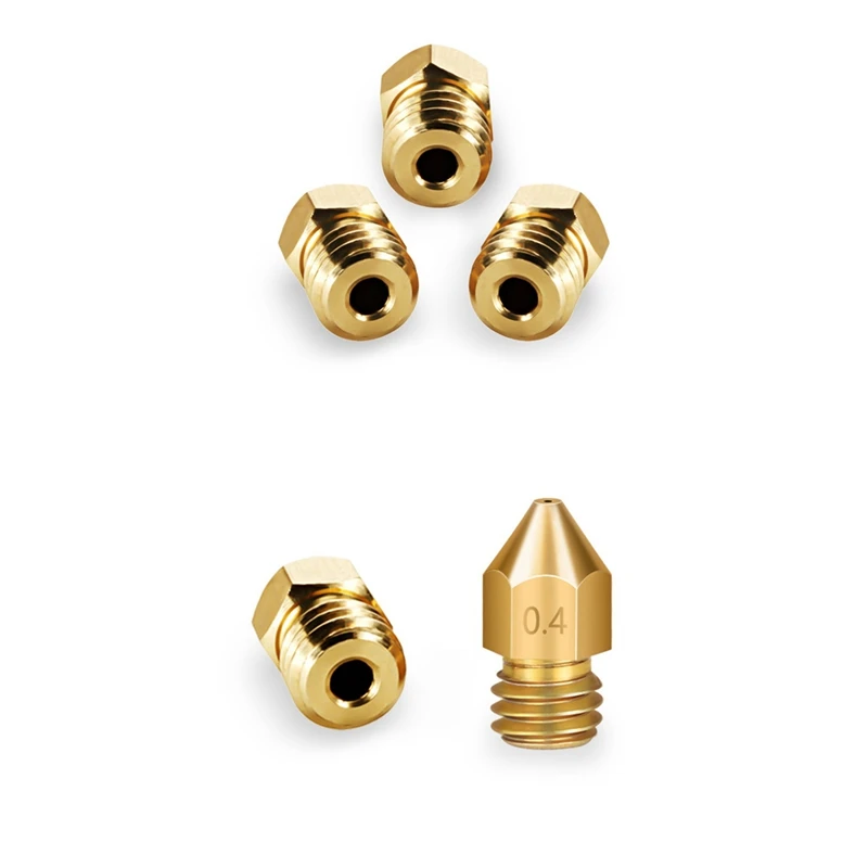 Boquilla de latón MK8. Mano de obra fina, la pared interior es lisa y lisa sin rebabas, y la rosca es lisa sin obstrucciones; Las juntas se ajustan firmemente y la superficie de contacto es plana, lo que evita eficazmente que el cabezal de impresión tenga fugas. El diseño del chaflán de corte reduce la resistencia de la castaña de agua a los consumibles y evita el taponamiento de la rosca.