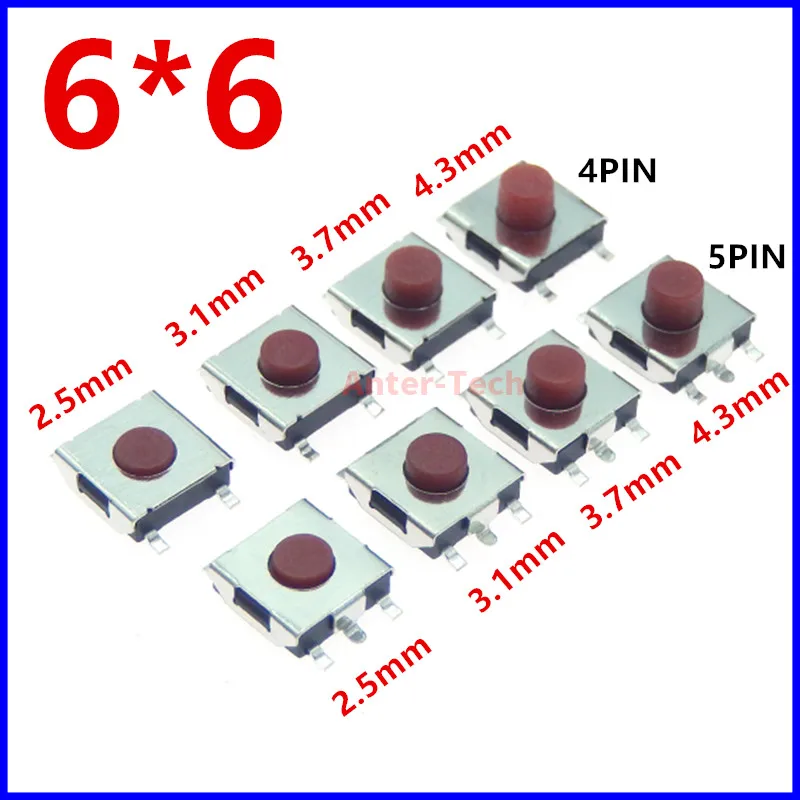 Comprar Botón Táctil rojo para montaje en PCB, 50/100 piezas, 6,2x6,2mm de altura = 2,5/2,7/3,1/3,7. 3/5mm, 4PIN/5PIN SMD(SMT), clic momentáneo 6x6