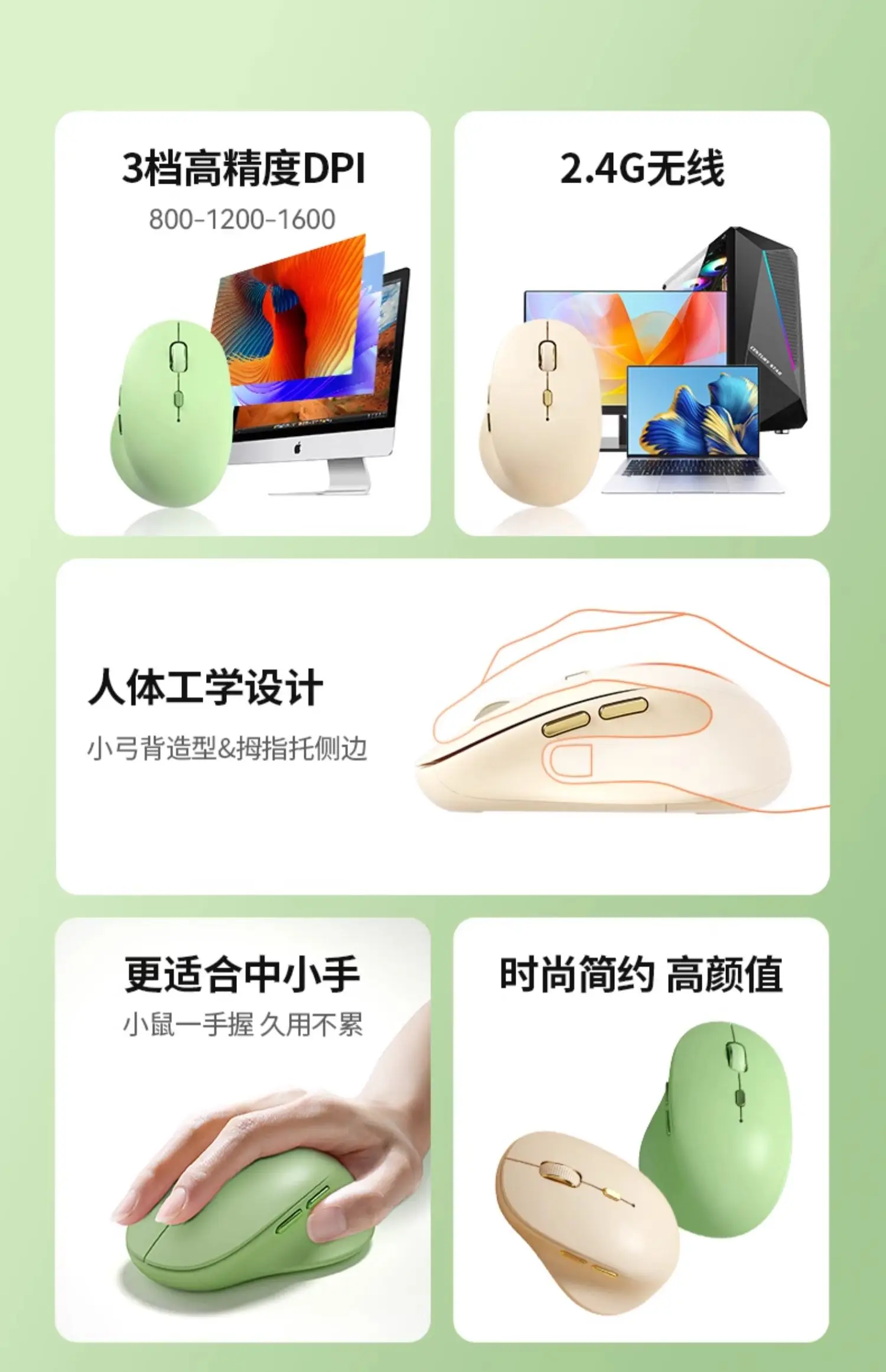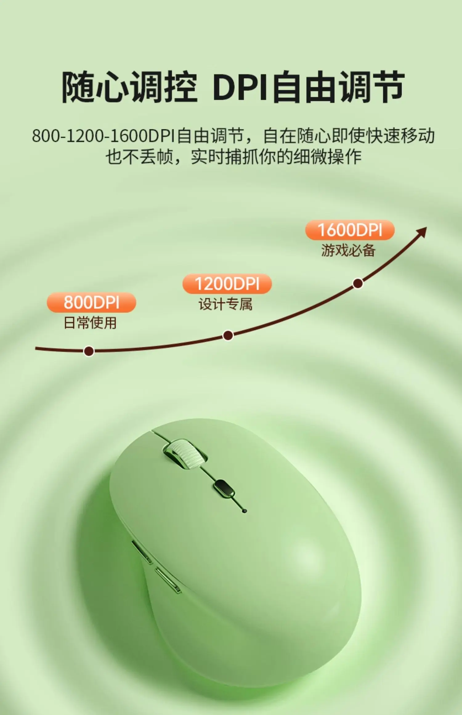 - DPI ajustable: Tiene tres niveles de DPI de alta precisión (800 - 1200 - 1600) que se pueden ajustar libremente para satisfacer diferentes escenarios, como uso diario, diseño y juegos.