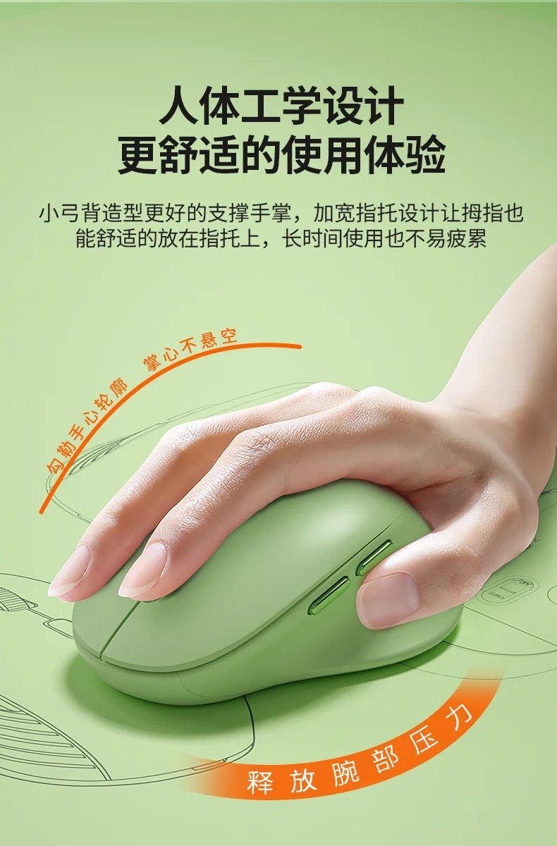 - Diseño ergonómico: Forma de espalda pequeña arqueada con un innovador reposapulgar, que proporciona un mejor soporte para la palma.El reposamuñecas ensanchado permite colocar cómodamente el pulgar, lo que reduce la fatiga durante el uso prolongado y alivia la presión de la muñeca.