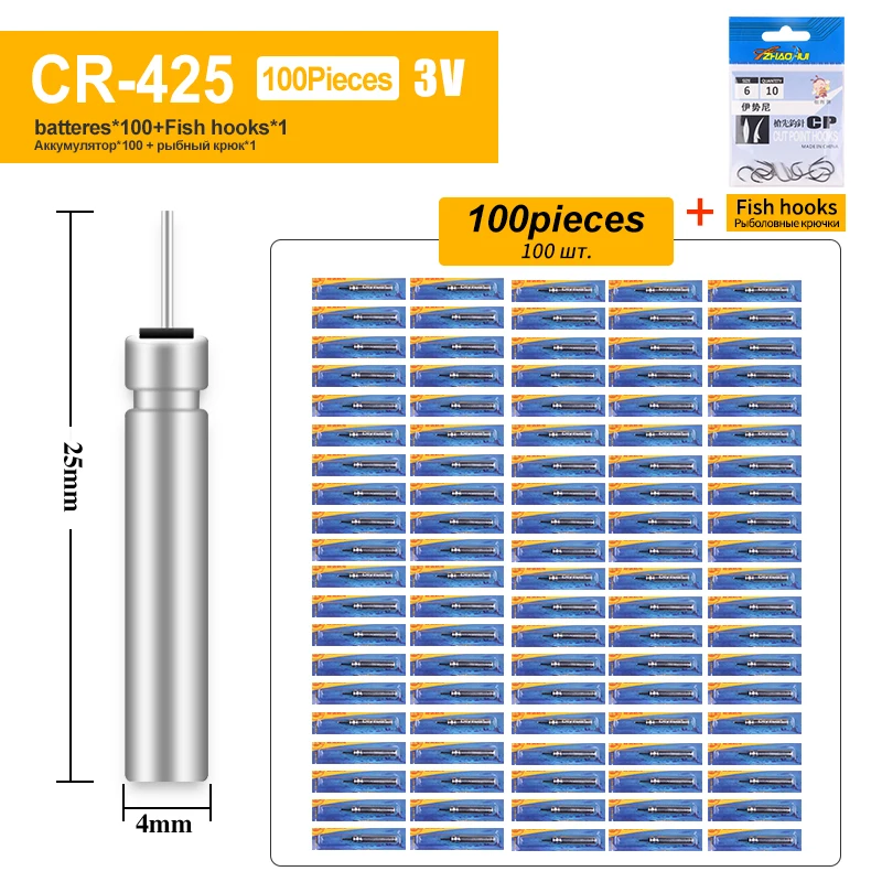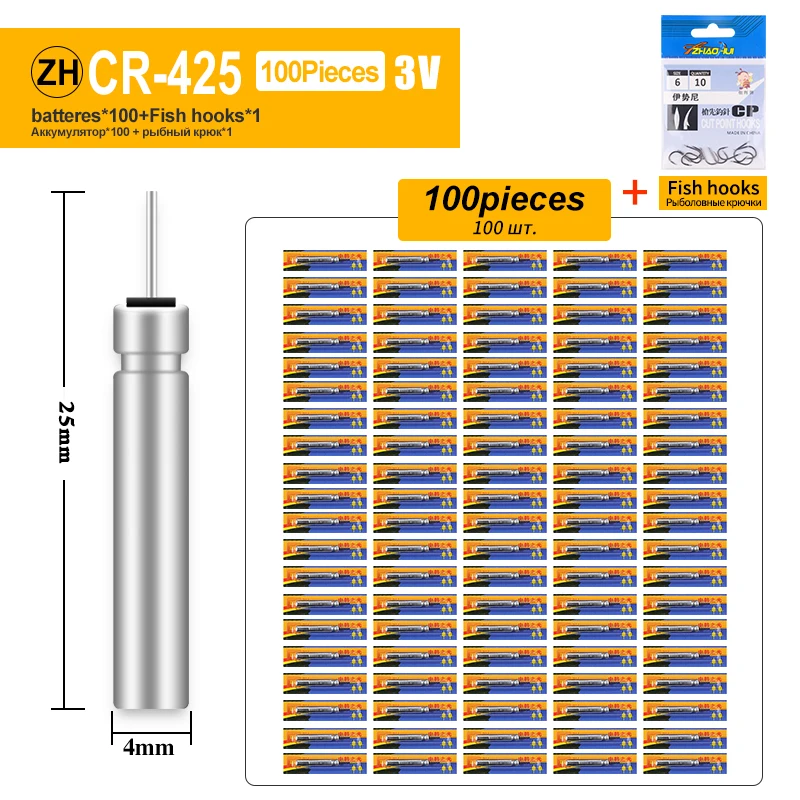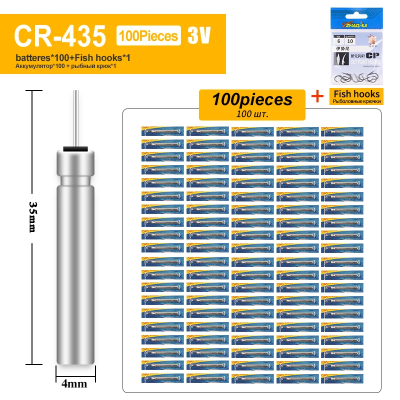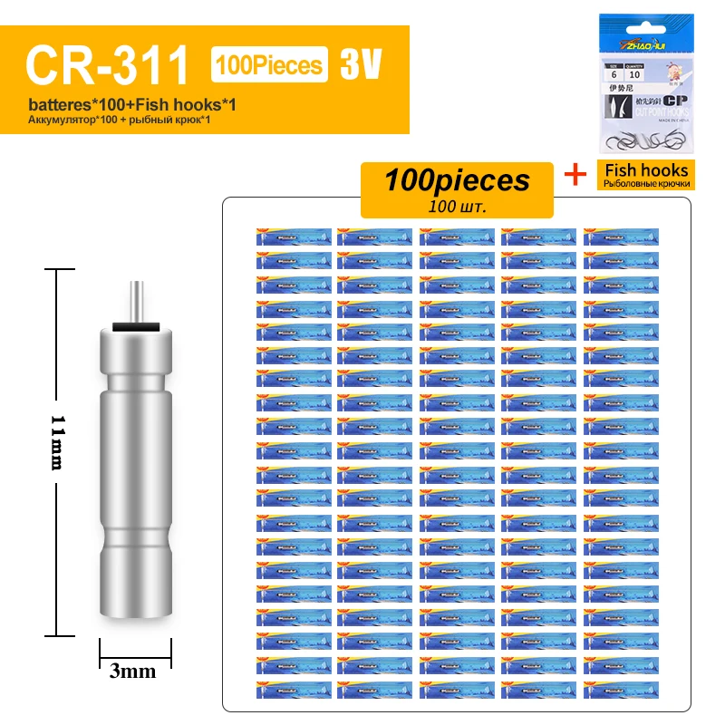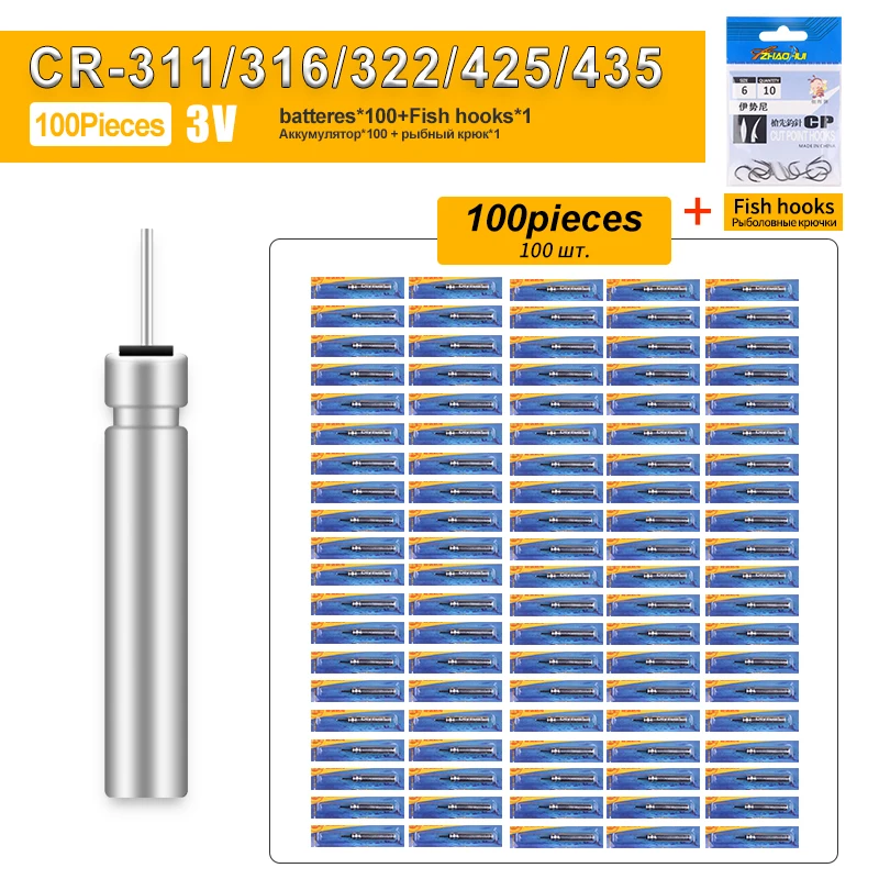 Aparejos de boya eléctrica de 100 piezas, herramientas de flotadores de pesca luminosos DLY CR311 316 322 425 435 ZH CR425 + 1 bolsa de anzuelos, accesorio de boya de pesca