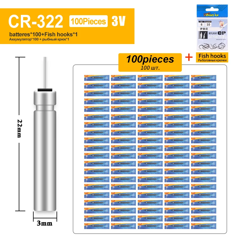 Aparejos de boya eléctrica de 100 piezas, herramientas de flotadores de pesca luminosos DLY CR311 316 322 425 435 ZH CR425 + 1 bolsa de anzuelos, accesorio de boya de pesca