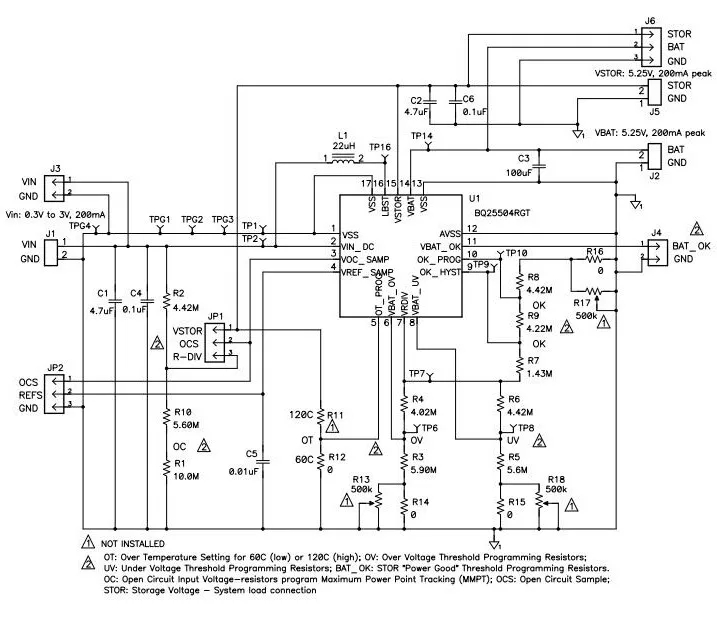 El bq25570 está diseñado para ser flexible para admitir una amplia gama de componentes de almacenamiento de energía.La fuente de energía de la que la cosechadora de energía extrae energía a menudo no se fija ni varía con el tiempo.Normalmente, el sistema requerirá algún tipo de componente de almacenamiento de energía, como una batería recargable, un condensador de gran tamaño o un condensador convencional.El componente de almacenamiento de energía hará disponible una energía constante específica cuando el sistema la requiera.El componente de almacenamiento de energía también permite que el sistema maneja cualquier corriente máxima que no pueda ser directamente desde la fuente de entrada.Para evitar daños a los componentes de almacenamiento de energía del cliente, controle los voltajes máximos y mínimos con referencia a los niveles internos de subtensión (UV) y sobretensión (OV) programables por el usuario.