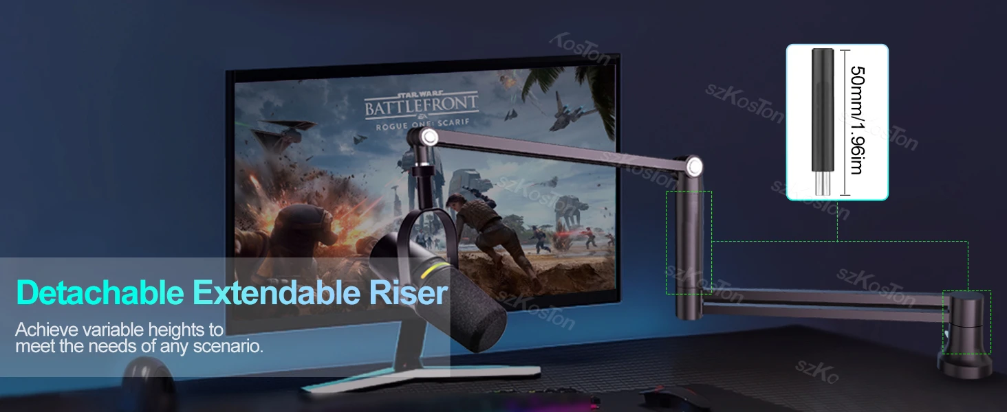 Longitud y altura adicionales: Equipado con una varilla de extensión de 10 cm, puede adaptarse a escritorios o distancias más amplios en monitores, asegurando que el micrófono y el brazo articulado no obstruyan su vista, lo que le permite ajustar el micrófono a la posición perfecta con un 360° brazo ajustable que gira según sus necesidades.