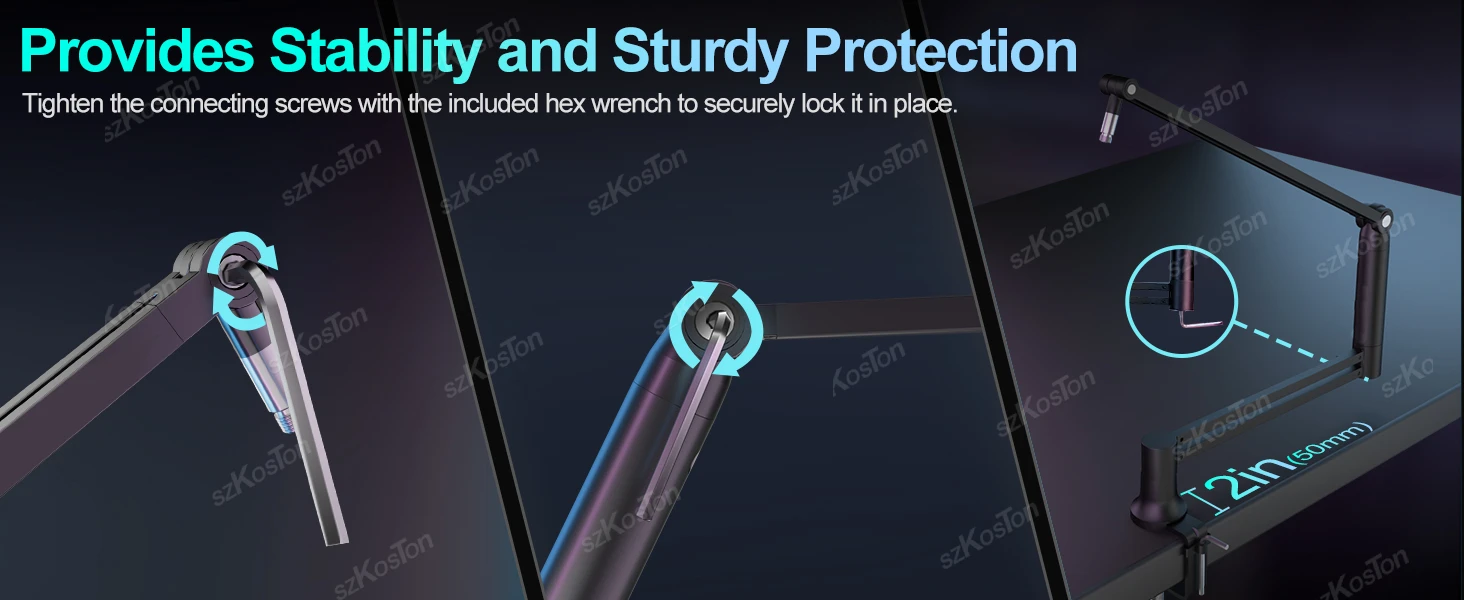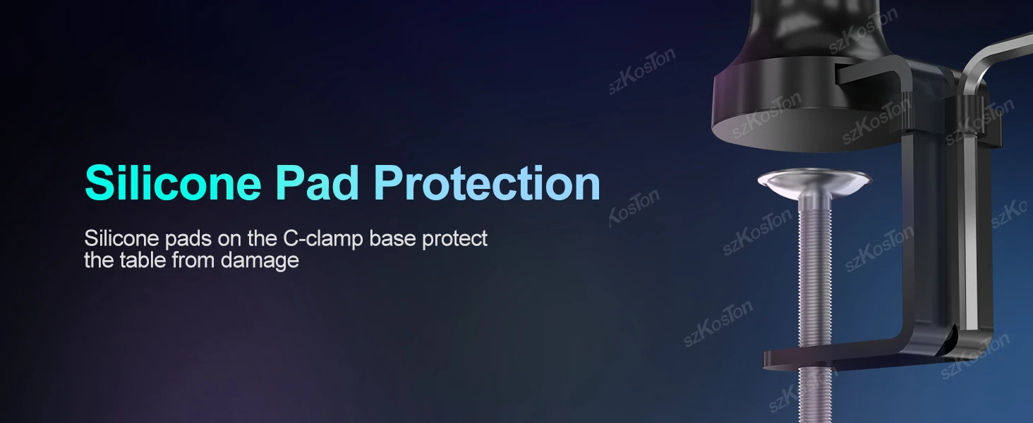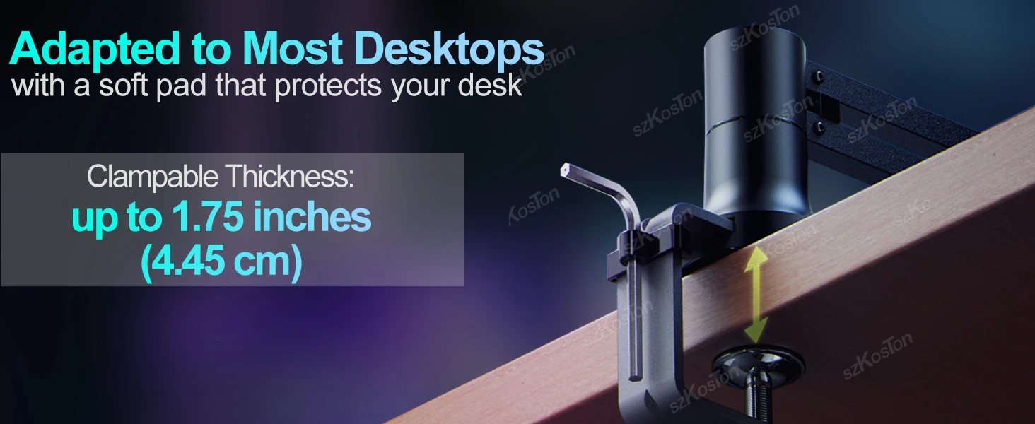 Soporte de escritorio robusto: cuenta con una abrazadera de escritorio segura con acolchado protector; Las juntas se pueden apretar con la llave hexagonal incluida para un soporte estable.