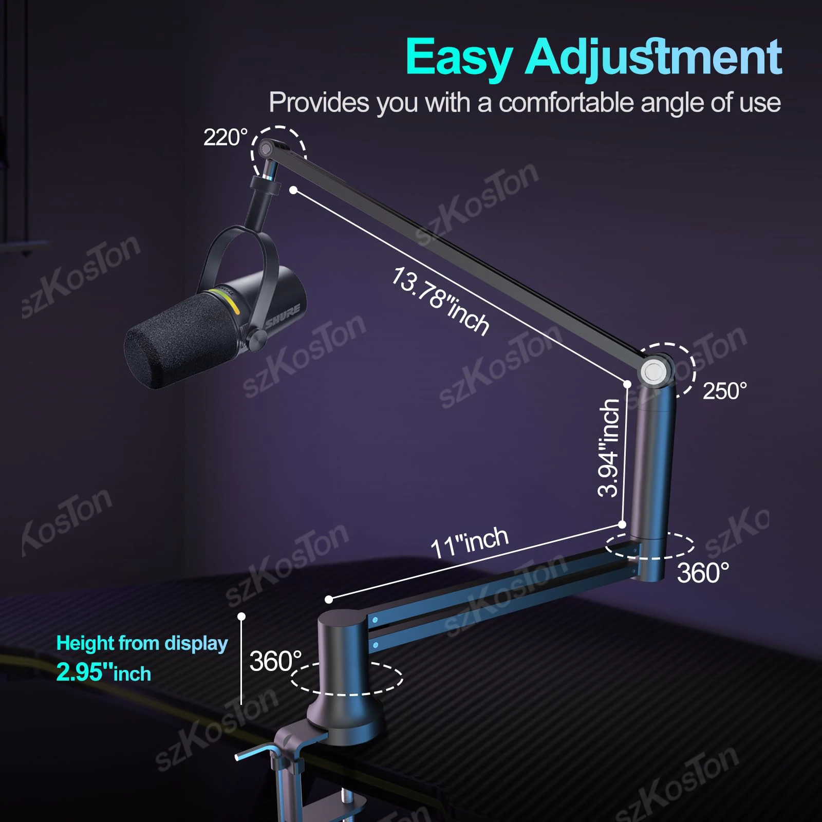 Fácil capacidad de ajuste: ofrece 360° rotación de la base, 250° extensión hacia adelante/atrás y 220° movimiento hacia arriba/abajo; Se pliega para un fácil almacenamiento.Szkoston