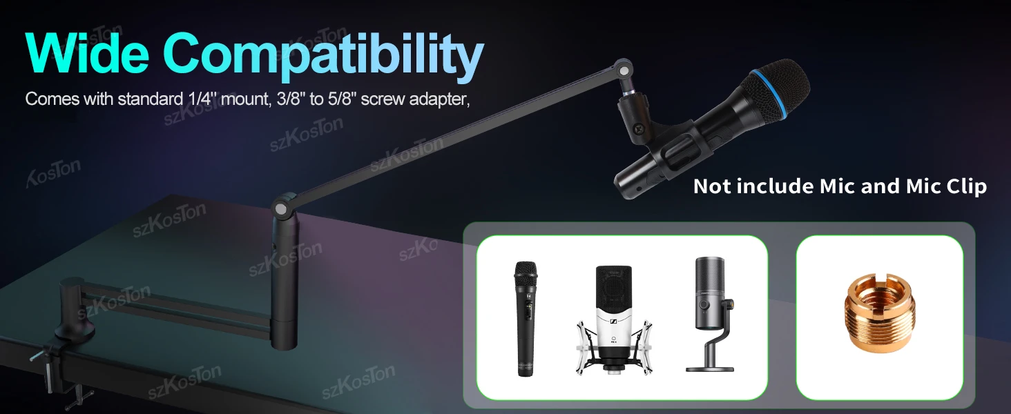 Compatibilidad universal: admite una amplia gama de micrófonos con roscas de 3/8" y 5/8"; Funciona con modelos populares como Blue Yeti, AT202020 y más.(Sugerimos que el peso del micrófono no supere los 1 kg)