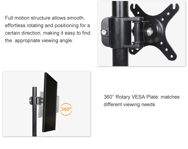 1. Escriba la dirección y el nombre en inglés, o el mensajero puede negarse a enviarlo.2. Los derechos de aduana e impuestos NO están incluidos en el costo de envío.3. Para la dirección del pedido, le sugerimos que use la dirección de la Oficina en lugar de la Dirección de casa, porque el servicio de mensajería seguramente trabaja en días laborables y horas de trabajo cada semana4. Por favor, no utilice la dirección de POST BOX para su pedido, por lo que el servicio de mensajería no acepta, gracias.DZ28 14 "-32" Altura ajustable Carga 8,5 kg Base de metal Monitor de inclinación Soporte de brazo de escritorio Rotación de pantalla única PC Soporte articulado