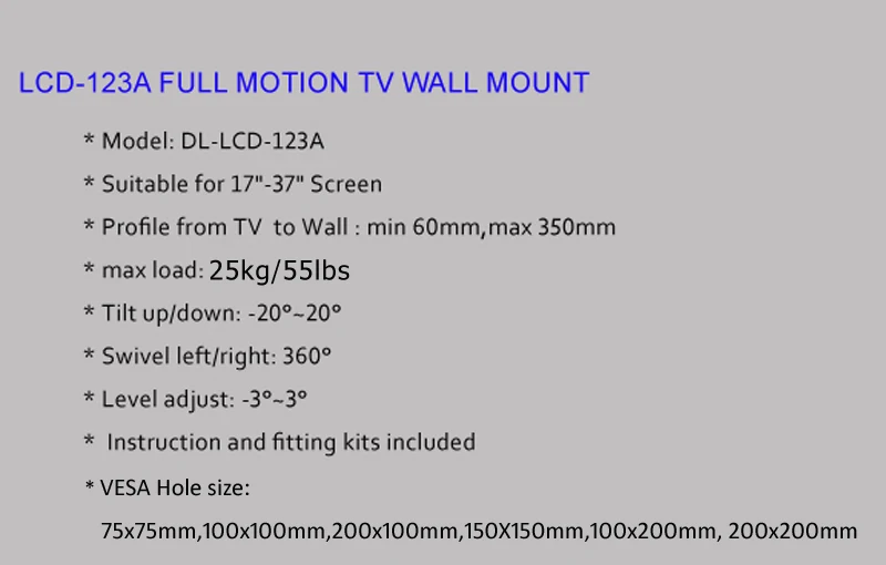 Brazo extensible de 10-37 pulgadas con movimiento completo para TV, montaje de pared para pantalla LCD-123A, máx. VESA 200x200 mm, carga de 20 kg, soporte de monitor