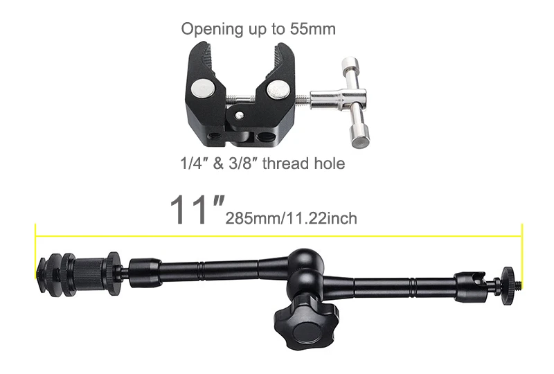 SUPER CLAMP- La abrazadera de brazo mágico tiene una hembra de 1/4-20 y una de 3/8-16, ambos tamaños estándares en la industria de la fotografía para cabezas y trípodes se pueden usar para una variedad de accesorios. Como cámaras, varillas de 15mm, luces led, paraguas, ganchos, estantes, vidrio de placa, barras cruzadas, etc.