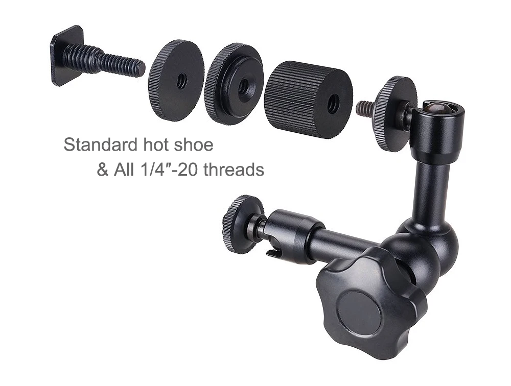 Brazo mágico: un lado tiene un tornillo de 1/4 "que se conecta al monitor, luz LED u otros accesorios. Otro lado es el soporte cuadrado de zapata caliente que se puede montar fácilmente en su cámara DSLR. Y este soporte de Zapata es extraíble para convertirse en otro tornillo de 1/4 ", por lo que ambos extremos son tornillos de 1/4" que puede conectar a diferentes equipos.