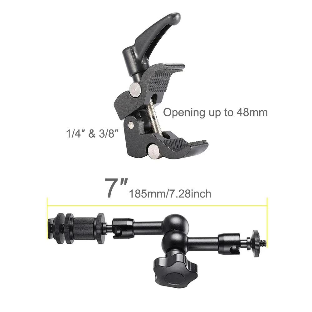 SUPER CLAMP- La abrazadera de brazo mágico tiene una hembra de 1/4-20 y una de 3/8-16, ambos tamaños estándares en la industria de la fotografía para cabezas y trípodes se pueden usar para una variedad de accesorios. Como cámaras, varillas de 15mm, luces led, paraguas, ganchos, estantes, Placas de vidrio, barras transversales, etc.