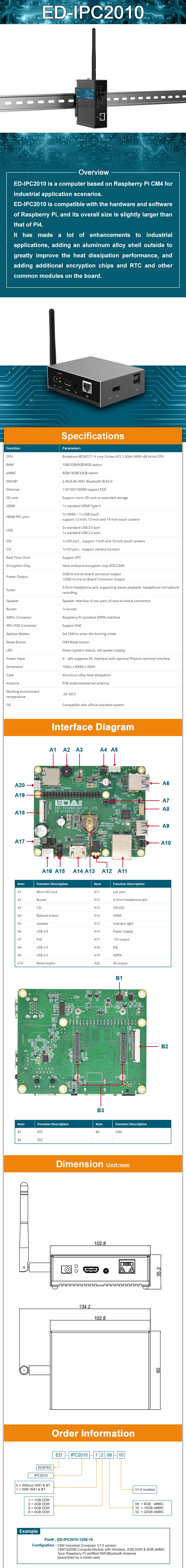 Broadcom BCM2711 ED-IPC2010, basado en Raspberry Pi CM4, con CPU 4 Core Cortex A72 de 1,5 Ghz y 64 bits, hasta 8 GB de RAM